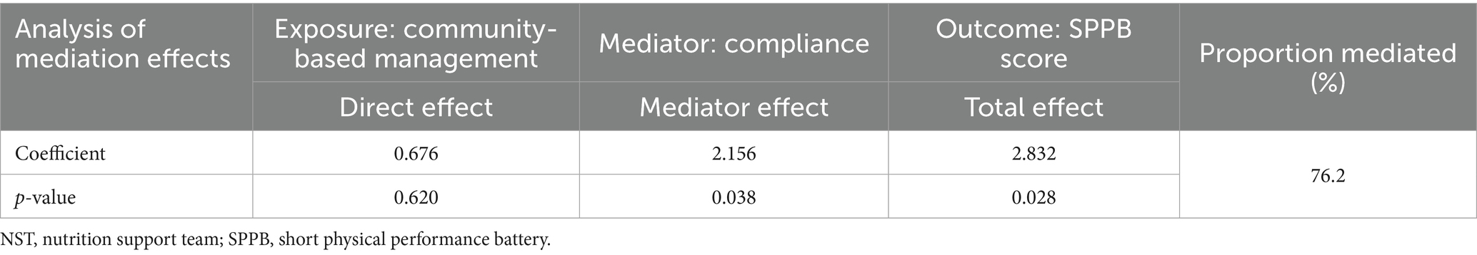 Compliance significantly mediated the effect of NST community-based management on the SPPB score, accounting for 76.2% of the total effect (p = 0.038) (Table 4).