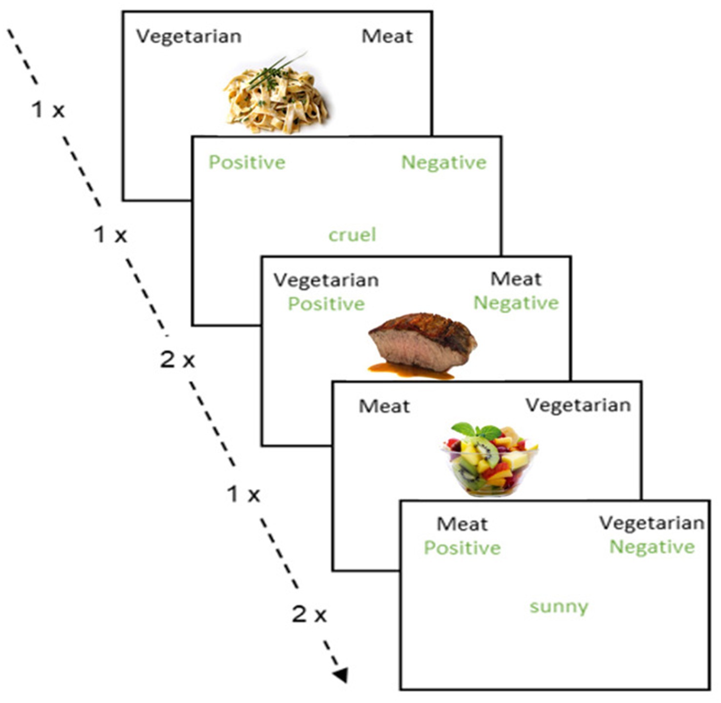 The standard Implicit Association Test (IAT) was chosen to assess implicit attitudes (22). The IAT used in this study was adapted from the version of Winkelmair and Jansen (61). It comprises four categories: two target categories and two attribute categories, along with various stimuli, including target images and attribute words. As target categories, “vegetarian” and “meat” were used, and as attribute categories, “positive” and “negative” were employed. Target categories denoted food types and were presented as “vegetarian” and “meat.” In the present context these labels referred to vegetarian food and meat-based food, respectively, rather than to dietary identities. As target images and attribute words, we used the same 10 pictures of vegetarian or meat-based foods as in the explicit affective evaluation, along with five positive and five negative words from the Berlin Affective Word List (35). Consistent with the explicit evaluation task, the label “vegetarian” in the IAT refers to the same lacto-ovo vegetarian set of five images, which included two items with cheese and three strictly plant-based items. Participants were instructed to sort images or words appearing in the center of the screen by pressing the left (“D”) or right (“K”) key, depending on the assigned categories.