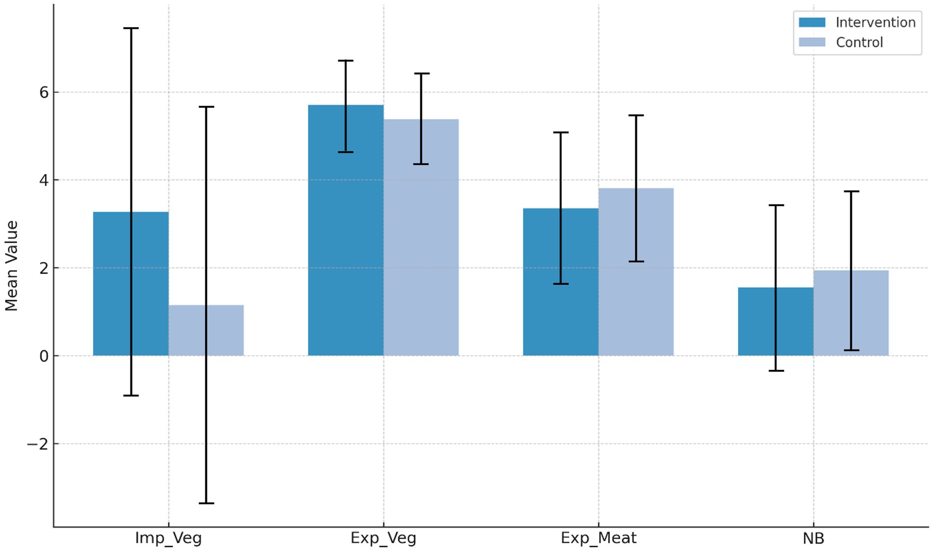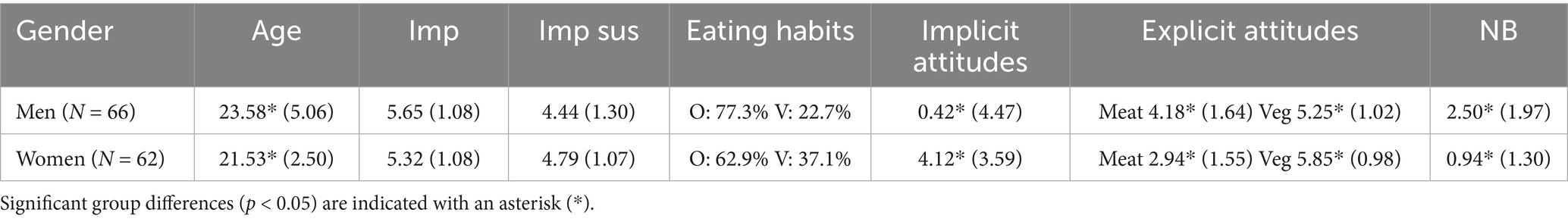 Figure 2. Group comparison of unadjusted means (SD) of implicit attitudes toward vegetarian nutrition (Imp_Veg), explicit attitudes toward vegetarian nutrition (Exp_Veg) and meat-based nutrition (Exp_Meat) and nutritional behavior (NB).