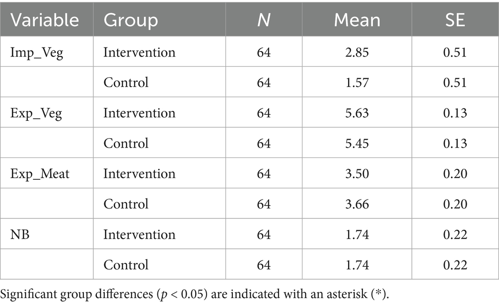 Furthermore, there is no statistical difference between participants of the intervention and the control group regarding age [t (126) = −0.28, p = 0.783], importance of nutrition [t (126) = −0.80, p = 0.936], importance of sustainable nutrition [t (126) = 0.73, p = 0.465], and eating habits [χ2 (2) = 0.41, p = 0.816]. Conversely, a statistical difference exists between the intervention and control groups regarding gender [χ2 (1) = 8.01, p = 0.005].
