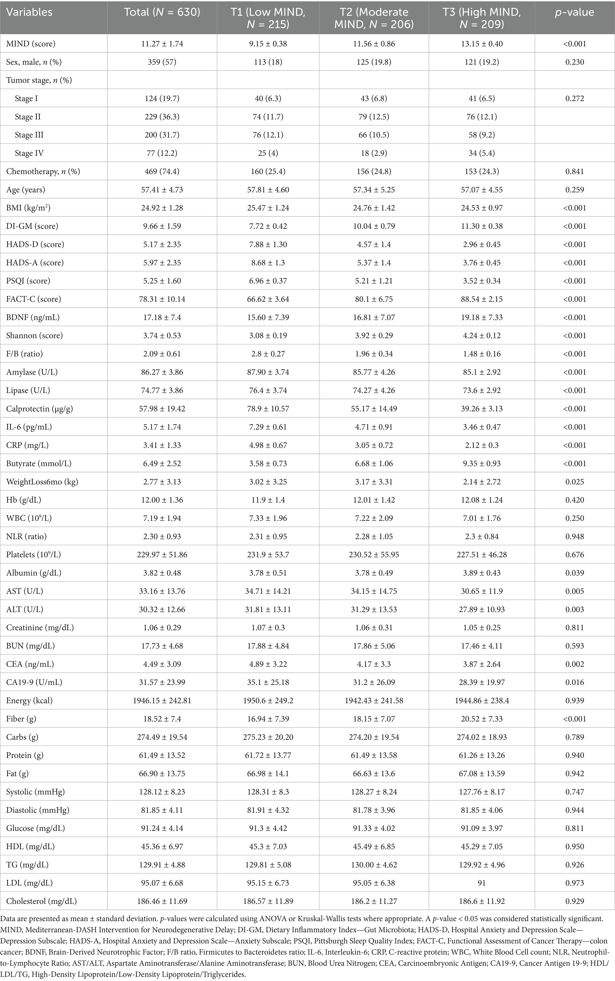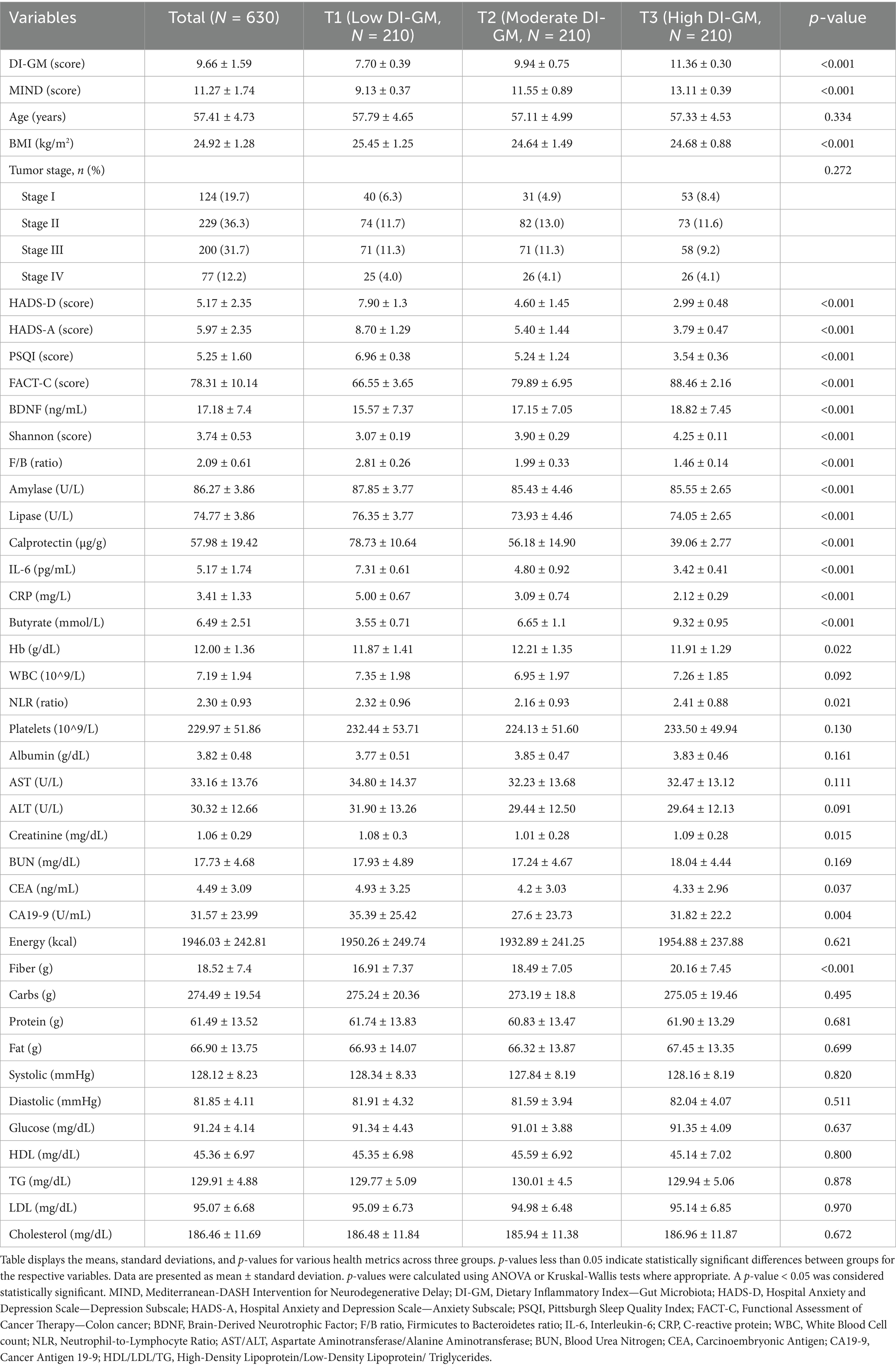 The study cohort included 630 colon cancer patients divided into MIND score Tertiles (T1–T3). The study population had a mean age of 57.41 ± 4.73 years, with 57% male participants, a mean BMI of 24.92 ± 1.28 kg/m2, and a tumor stage distribution of approximately 19.7% stage I, 36.3% stage II, 31.7% stage III, and 12.2% stage IV. Mean MIND scores differed significantly across Tertiles (p < 0.001), increasing from 9.15 ± 0.38 in T1 to 13.15 ± 0.40 in T3. Age did not differ significantly (p = 0.259), but BMI was lower in T2 and T3 compared to T1 (p < 0.001). The DI-GM score increased alongside MIND Tertiles, peaking at 11.30 ± 0.38 in T3 (p < 0.001). No significant differences were observed across tertiles in sex distribution (p = 0.230), tumor stage (p = 0.272), or receipt of chemotherapy (p = 0.841).