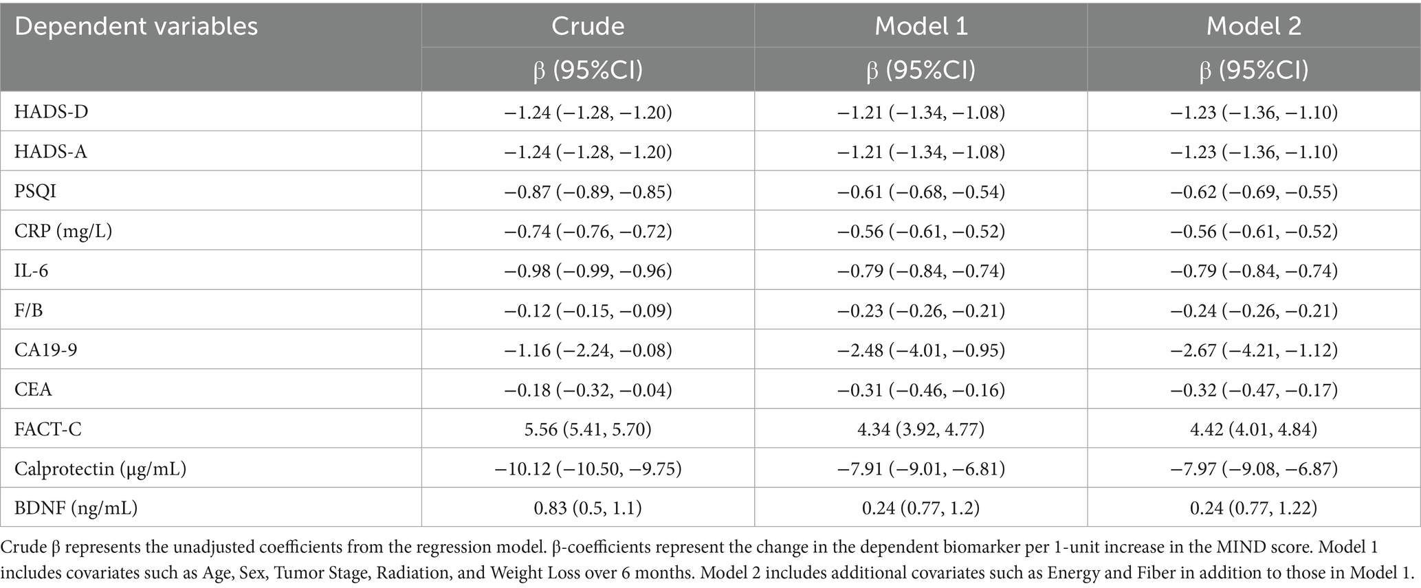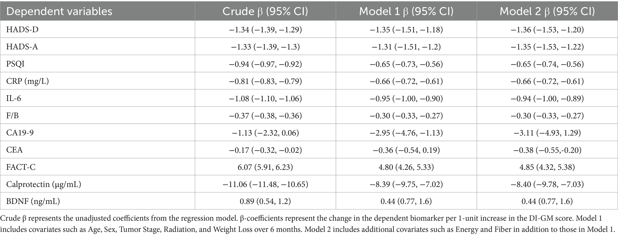 Multivariate linear regression analyses (Tables 3, 4) revealed that higher MIND and DI-GM scores were significantly associated with better psychological health, reduced systemic inflammation, and beneficial gut microbiota profiles. In fully adjusted models (Model 2), each one-unit increase in the MIND score correlated with lower depression (HADS-D β = −1.23, 95% CI: −1.36 to −1.10) and anxiety (HADS-A β = −1.23, 95% CI: −1.36 to −1.10) scores, better sleep quality (PSQI β = −0.62, 95% CI: −0.69 to −0.55), decreased inflammatory markers CRP (β = −0.56, 95% CI: −0.61 to −0.52) and IL-6 (β = −0.79, 95% CI: −0.84 to −0.74). The MIND score was also inversely associated with gut microbiota imbalance, as indicated by a lower F/B ratio (β = −0.24, 95% CI: −0.26 to −0.21), and reduced fecal calprotectin levels (β = −7.97, 95% CI: −9.08 to −6.87), suggesting attenuated intestinal inflammation. Furthermore, higher MIND scores were associated with better quality of life (FACT-C β = 4.42, 95% CI: 4.01 to 4.84), lower CA19-9 levels (β = −2.67, 95% CI: −4.21 to −1.12), and modest increases in serum BDNF (β = 0.24, 95% CI: 0.77 to 1.22), though the latter showed wide confidence intervals. Notably, CEA was inversely associated with MIND score (β = −0.32, 95% CI: −0.47 to −0.17), indicating a potentially complex relationship with tumor markers.