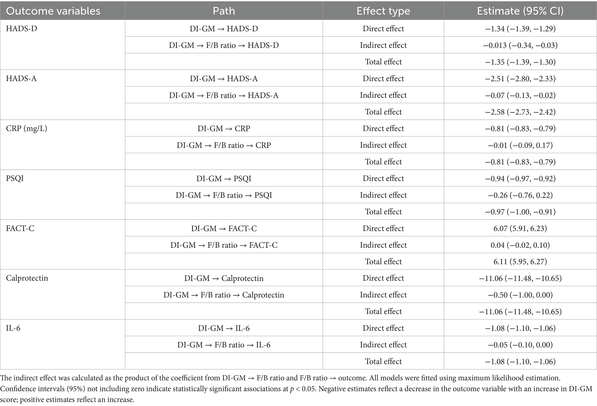 Mediation analyses (Table 5) evaluated whether the F/B ratio mediated associations between DI-GM scores and health outcomes. DI-GM was associated with significant direct effects on depression, anxiety, inflammation, sleep quality, and quality of life. The F/B ratio partially mediated the association between DI-GM and depression (indirect effect = −0.013, 95% CI: −0.34 to −0.03) and anxiety (indirect effect = −0.07, 95% CI: −0.13 to −0.02), suggesting gut microbiota composition partly underlies the beneficial effects of DI-GM on psychological symptoms. For other outcomes (CRP, PSQI, FACT-C, calprotectin, IL-6), indirect effects were non-significant, indicating additional pathways beyond F/B ratio contribute to DI-GM’s health benefits.