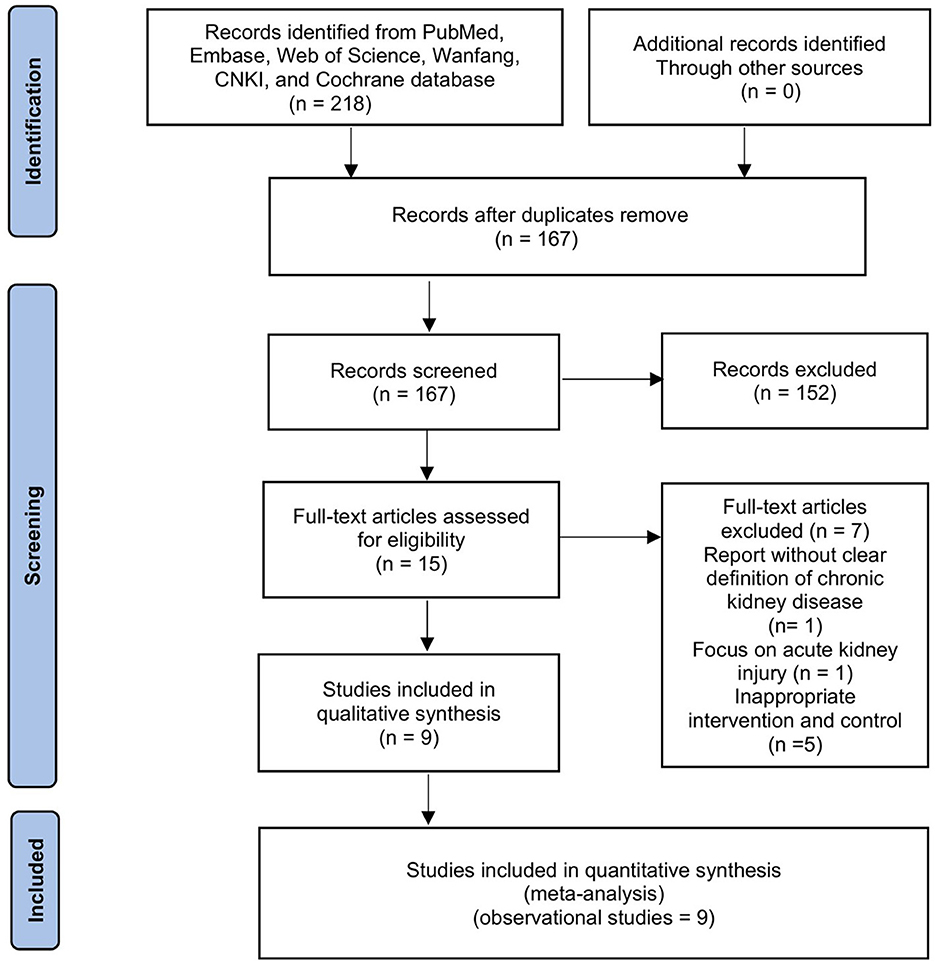 The initial search resulted in 218 entries. After removing duplicates and screening titles and abstracts, 16 articles were selected for full-text review. Two authors independently assessed these articles, and seven studies were excluded (report without a clear definition of CKD, n = 1; focus on acute kidney injury, n = 1; inappropriate intervention and control, n = 5). Thus, nine cohort studies involving 31,673 patients met our inclusion criteria (Figure 1) (1618, 2328). In particular, in the two studies that recruited mixed populations, only adults with CKD were included in our final meta-analyses.