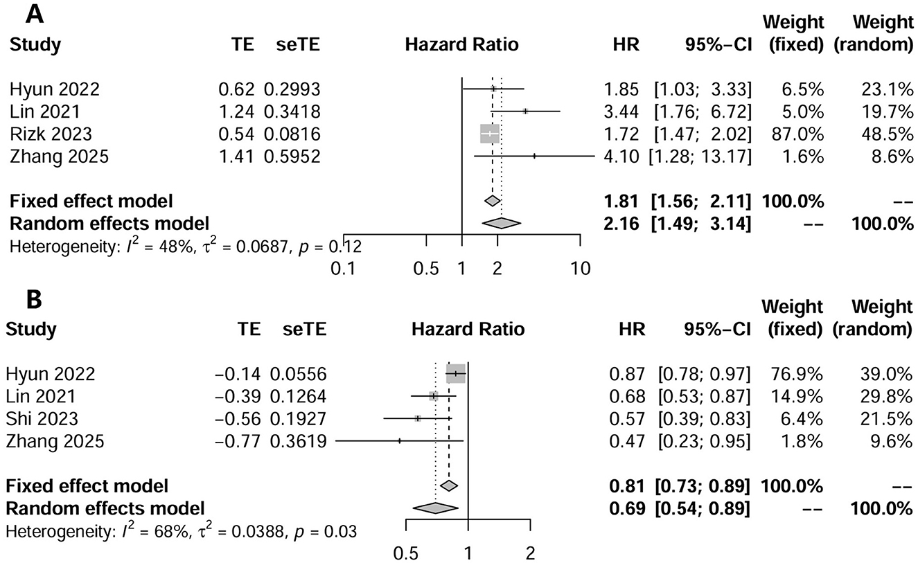 This image contains two forest plots titled A and B. Plot A, with studies by Hyun 2022, Lin 2021, Rizk 2023, and Zhang 2025, shows hazard ratios ranging from 1.72 to 4.10, indicating variability in effect sizes. The fixed effect model hazard ratio is 1.81, and the random effects model is 2.16, with heterogeneity I² of 48%. Plot B includes studies by Hyun 2022, Lin 2021, Shi 2023, and Zhang 2025, with hazard ratios from 0.47 to 0.87. The fixed effect model hazard ratio is 0.81, and the random effects model is 0.69, with heterogeneity I² of 68%.