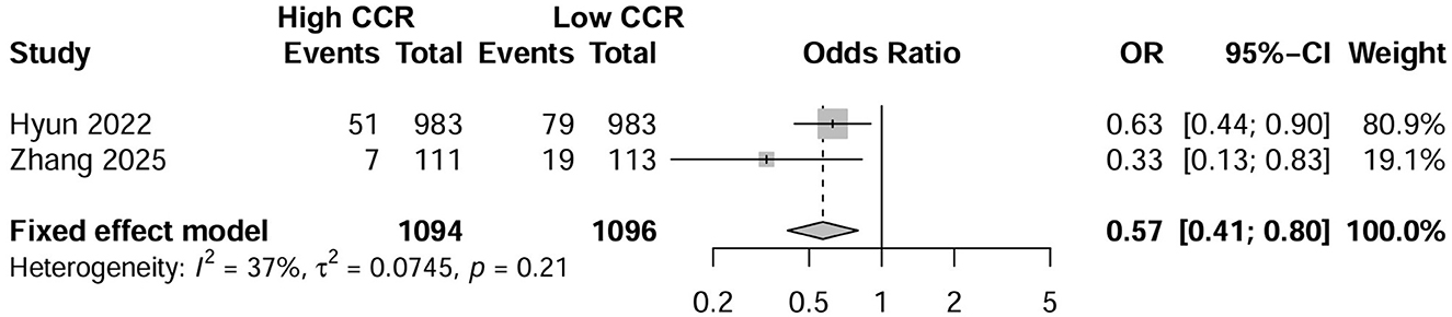 Forest plot comparing high and low CCR groups across two studies: Hyun 2022 and Zhang 2025. Hyun 2022 shows an odds ratio (OR) of 0.63 with a 95% confidence interval (CI) of 0.44 to 0.90 and weight of 80.9%. Zhang 2025 shows an OR of 0.33 with a 95% CI of 0.13 to 0.83 and weight of 19.1%. The fixed effect model shows an overall OR of 0.57 with a 95% CI of 0.41 to 0.80. Heterogeneity statistics include \(I^2 = 37%\), \(\tau^2 = 0.0745\), and \(p = 0.21\).