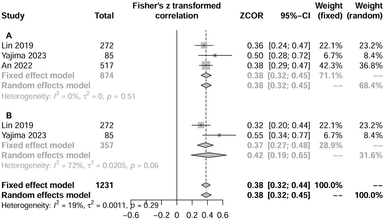 Figure 4. Forest plot showing the relationship between serum creatinine/cystatin C ratio and handgrip strength (A) or skeletal muscle index (B) using the correlation coefficient. HGS, hand grip strength; SMI, skeletal muscle index.