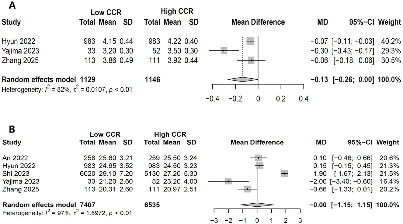 Forest plot showing two panels labeled A and B, comparing low and high CCR groups. Panel A details three studies with mean differences and a combined MD of -0.13. Panel B displays five studies with a combined MD of 0.00. Both panels use random effects models, indicating heterogeneity with significant p-values for analysis.