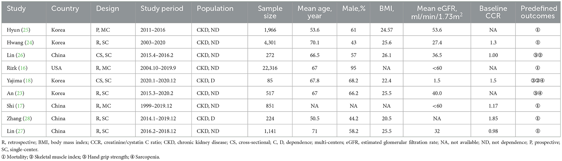 Table 1 summarizes the main characteristics of the included studies. Data related to the treatment of patients with CKD are summarized in Supplementary File 3. These studies were published between 2019 and 2023 in China (n = 4) (17, 2628), the USA (n = 1) (16), and Korea (n = 4) (18, 2325). The mean age of the participants was as follows: 50–60 years in two studies (25, 28), 60–70 years in four studies (16, 18, 23, 27), 70–80 years in two studies (24, 26), and unavailable in one study (17). The mean BMI ranged from 22.4 to 26.1 kg/m2. Seven studies focused on non-dialysis CKD patients, whereas the remaining recruited hemodialysis CKD patients (18, 28). Six studies examined the effect of CCR on mortality using regression analyses (16, 17, 2426, 28), and two studies examined the mortality between low or high CCR groups (25, 28). Regarding secondary outcomes, three studies evaluated the effect of CCR on muscle measurements of hand grip strength (HGS) and skeletal muscle index (SMI) (18, 23, 27).
