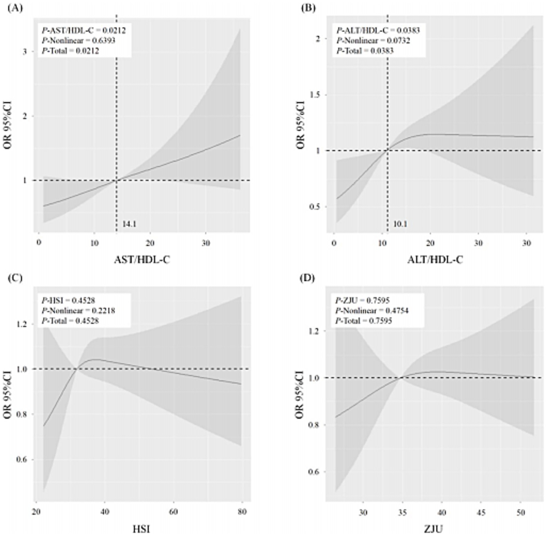 Figure 4. The restricted cubic spline (RCS) of the association between liver function (AST/HDL-C (A), ALT/HDL-C (B), HSI (C), and ZJU (D)) and the risk of MCI. The solid lines indicate estimates of the risk of MCI across the continuous level of liver function indices (AST/HDL-C, ALT/HDL-C, HSI, and ZJU), fitted using logistic regression analysis. The shaded areas indicate the 95% confidence intervals. MCI, mild cognitive impairment; AST, aspartate transaminase; ALT, alanine aminotransferase; HDL-c, high-density lipoprotein cholesterol; HSI, hepatic steatosis index. p < 0.05 was considered statistically different.