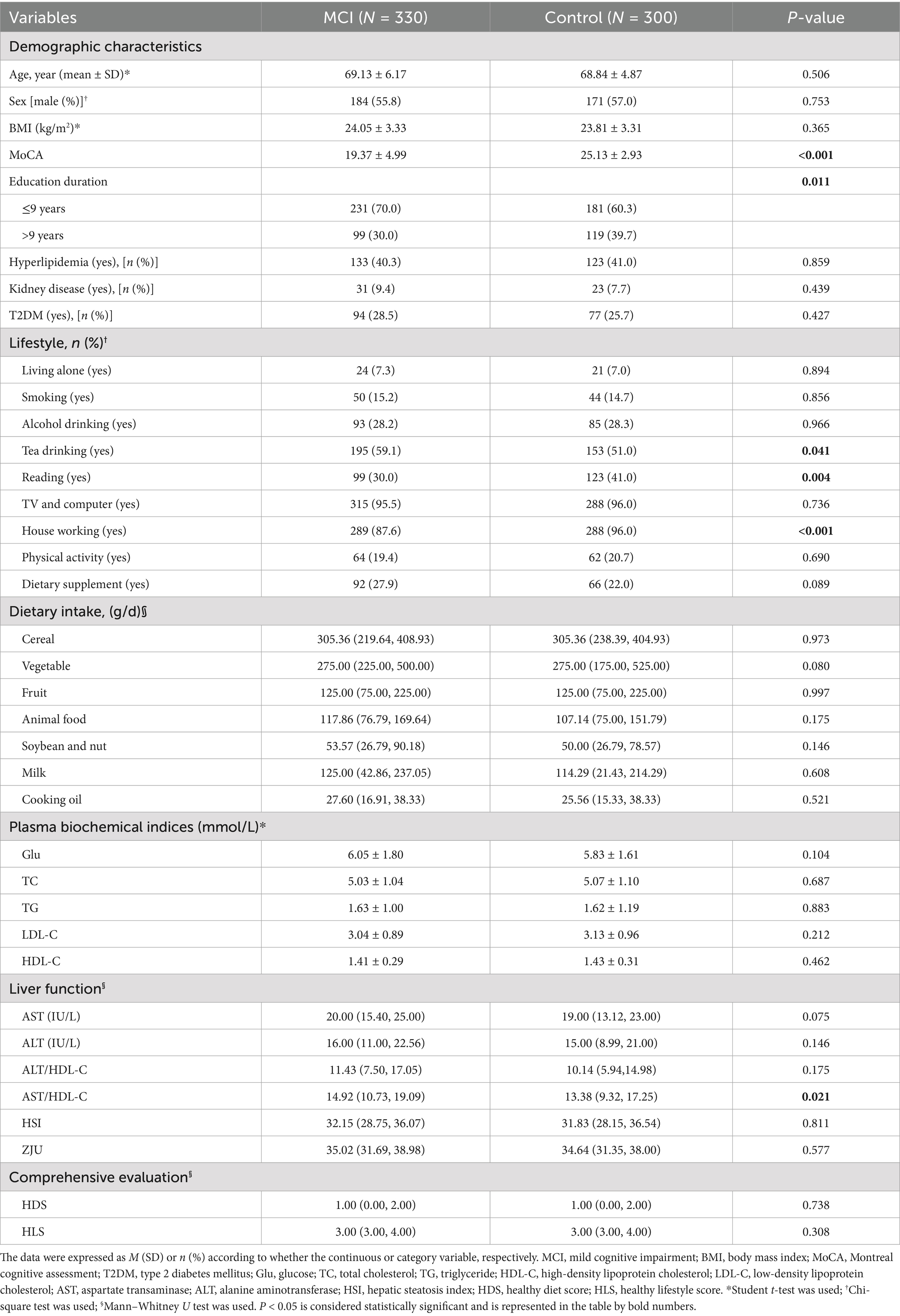 The results for all participants (N = 1,096) are presented in Supplementary Table 4. The HDS for the general population ranged from 1 to 6 (Cooking oil data missing), with a median value of 1. The HLS ranged from 1 to 5, with a median of 4. The results of participants’ complete cognitive measurement (N = 630) are provided in Table 1. Patients with MCI had lower MoCA scores and shorter education duration (p < 0.05). In terms of lifestyle, MCI patients were more likely to drink tea and less likely to engage in reading or housework (p < 0.05). Regarding liver function, MCI patients had a higher plasma AST/HDL-C ratio (p < 0.05). There were no significant differences in HDS or HLS between groups (p > 0.05).