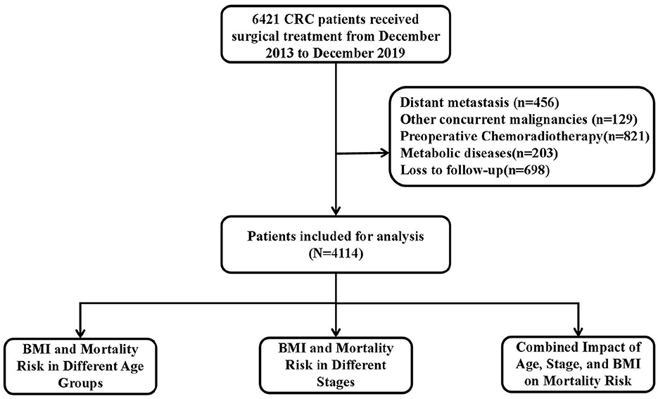 This study enrolled 6,421 CRC patients confirmed by pathology, 2,307 patients were excluded for the following reasons: distant metastasis (n = 456), other concurrent malignancies (n = 129), preoperative chemoradiotherapy (n = 821), metabolic diseases (n = 203), and loss to follow-up (n = 698), and 4,114 were finally analyzed after screening. Figure 1 shows the study flowchart. Among the included patients, 59.6% were male and 40.4% were female; 22.8% had right-colon cancer, 24.9% left-colon cancer, and 53.3% rectal cancer. The mean age at diagnosis was 61.1 years (SD = 12.1). The proportions of patients in stages I, II, and III were 18.3%, 37.9%, and 43.8%, respectively. The follow-up time in our study ranged from 2 to 95 months, with a median follow-up of 42 months. We categorized patients based on BMI, age, and stage and analyzed the baseline characteristics of each group.