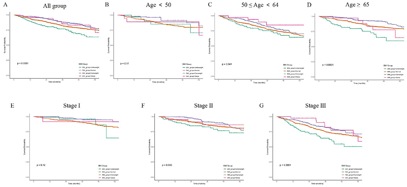 Figure 3. (A) K-M curves for overall survival across different BMI groups. (B) K-M curves for overall survival by BMI groups in patients aged < 50. (C) K-M curves for overall survival by BMI groups in patients aged 50–64. (D) K-M curves for overall survival by BMI groups in patients aged ≥65. (E) K-M curves for overall survival by BMI groups in Stage I patients. (F) K-M curves for overall survival by BMI groups in Stage II patients. (G) K-M curves for overall survival by BMI groups in Stage III patients.