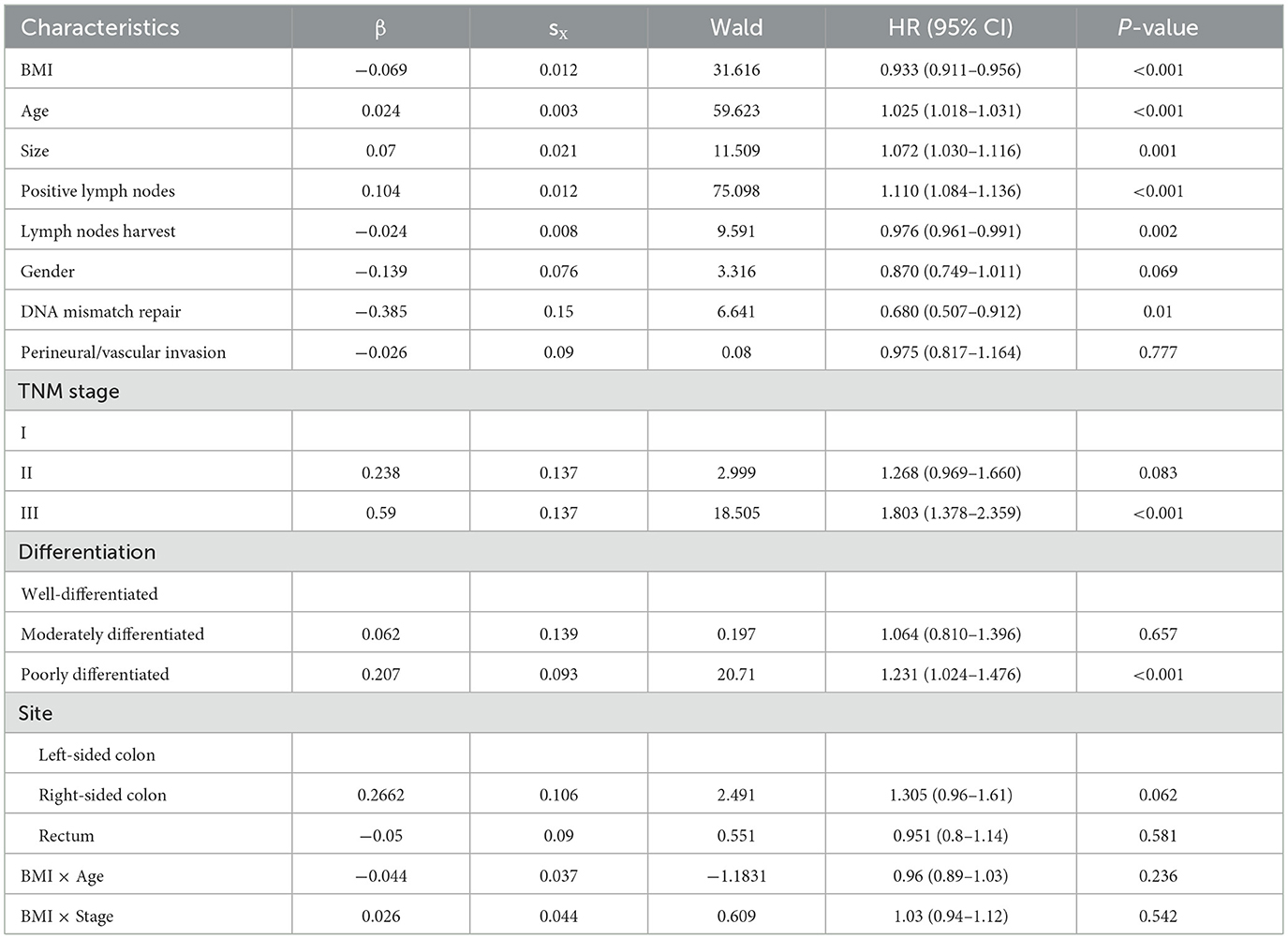 A multivariate Cox regression analysis was performed to assess the relationships between key prognostic factors and mortality risk, adjusting for potential confounders. Each unit increase in BMI was associated with a 7% decrease in mortality risk (HR = 0.933, 95% CI: 0.911–0.956, P < 0.001). Mortality risk increased by 2.5% per year of age (HR = 1.025, 95% CI: 1.018–1.031, P < 0.001). Tumor size was linked to mortality risk, with a 7.2% increase per cm (HR = 1.072, 95% CI: 1.030–1.116, P = 0.001). Each additional positive lymph node was associated with an 11% increase in mortality risk (HR = 1.110, 95% CI: 1.084–1.136, P < 0.001). Conversely, each additional harvested lymph node was associated with a 2.4% decrease in mortality risk (HR = 0.976, 95% CI: 0.961–0.991, P = 0.002). Patients with dMMR had a 32% lower mortality risk than those with pMMR (HR = 0.680, 95% CI: 0.507–0.912, P = 0.01). Compared to stage I, stage III CRC was associated with an 80.3% increase in mortality risk (HR = 1.803, 95% CI: 1.378–2.359, P < 0.001). Poorly differentiated tumors carried a 23.1% higher mortality risk than well-differentiated ones (HR = 1.231, 95% CI: 1.024–1.476, P < 0.001). Other variables, including gender, S100, CD34, and tumor location, were not significantly associated with mortality risk (Table 4).