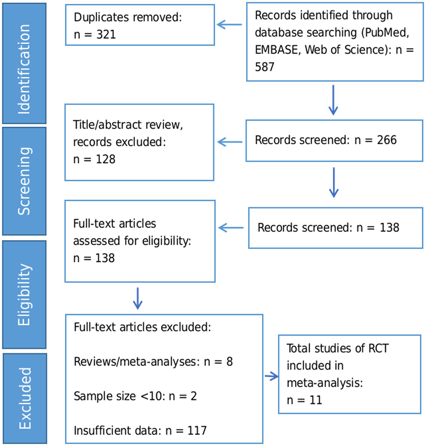 We identified 587 records through database searching. After removing 321 duplicates, 266 records remained for title/abstract screening. Of these, 128 records were excluded based on title/abstract criteria, leaving 138 full-text articles for detailed assessment. Finally, 11 RCTs with a total of 662 participants were included in the meta-analysis. The flow diagram of the study selection process is exhibited in Figure 1.