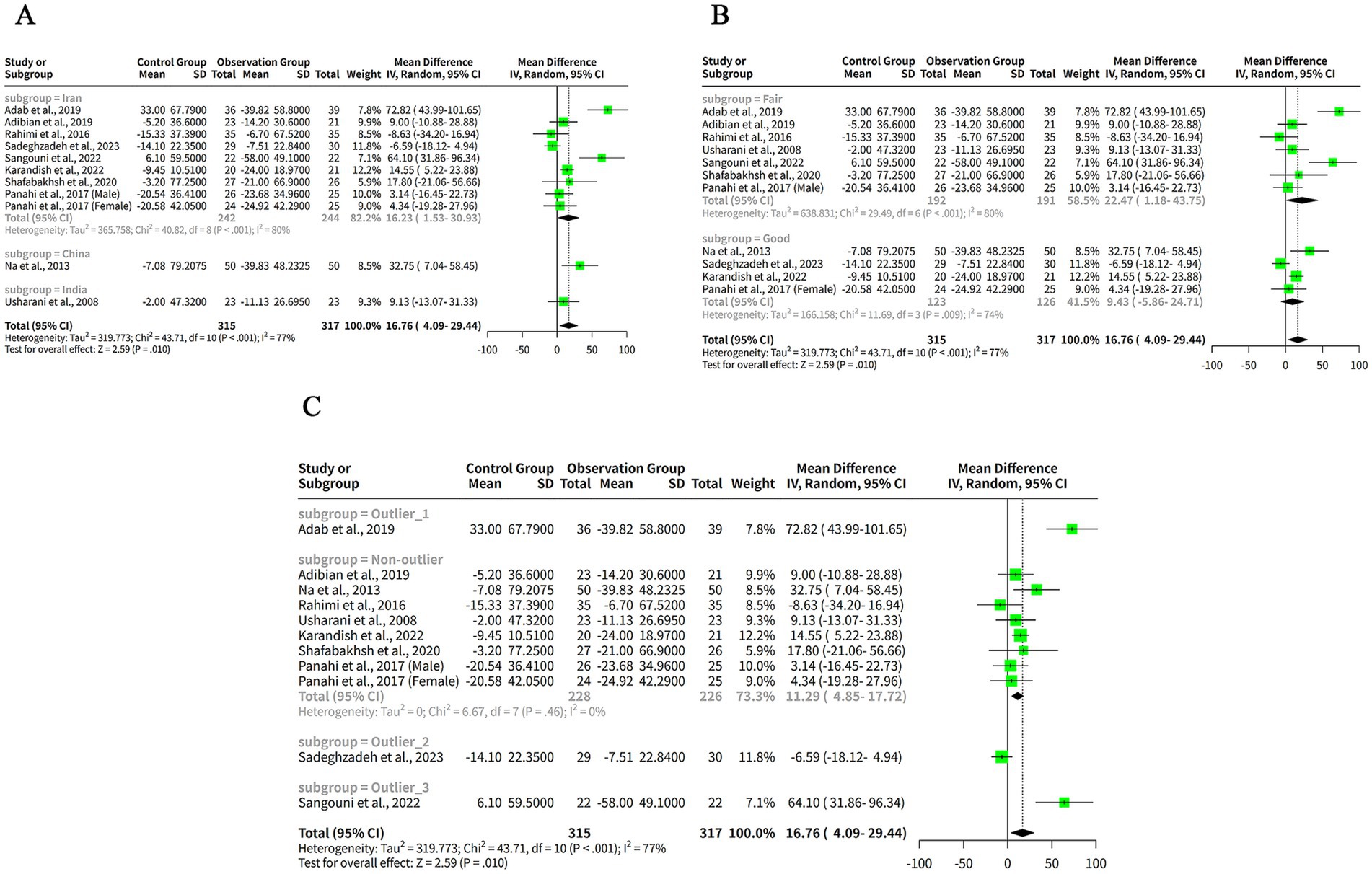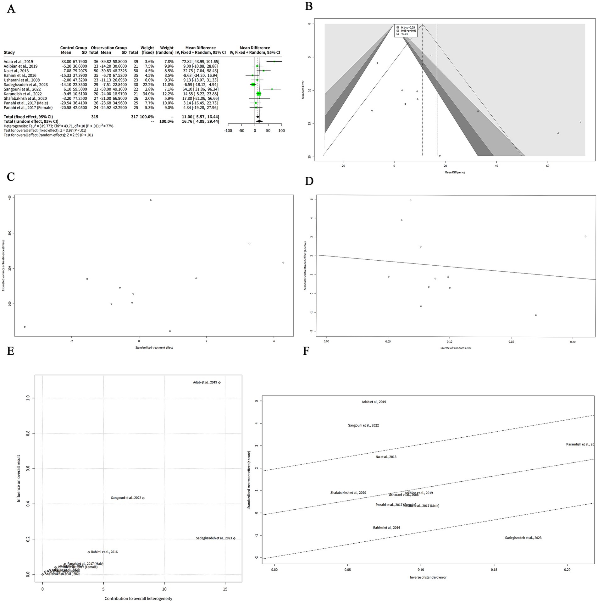 The Galbraith plot of our meta-analysis is shown in Figure 6C. We observed that all the included studies were distributed in the four regions. The studies of Panahi et al. (10) (Male subgroup) and Panahi et al. (10) (Female subgroup) were in the fourth region from the top, which means that they had large and positive effect sizes with low precision. These studies were outliers and may have introduced heterogeneity. The other studies were in the second and third regions, which means that they had moderate effect sizes with moderate or high precision.
