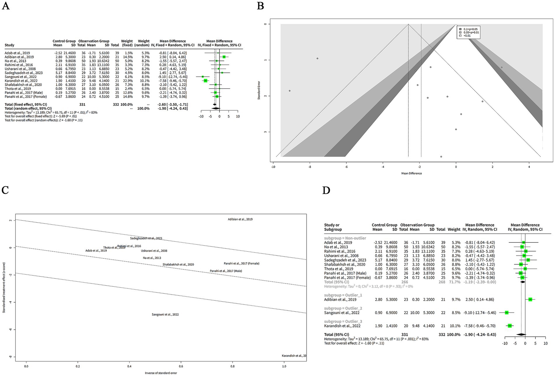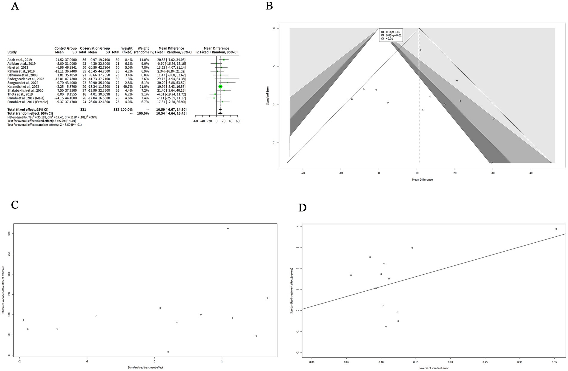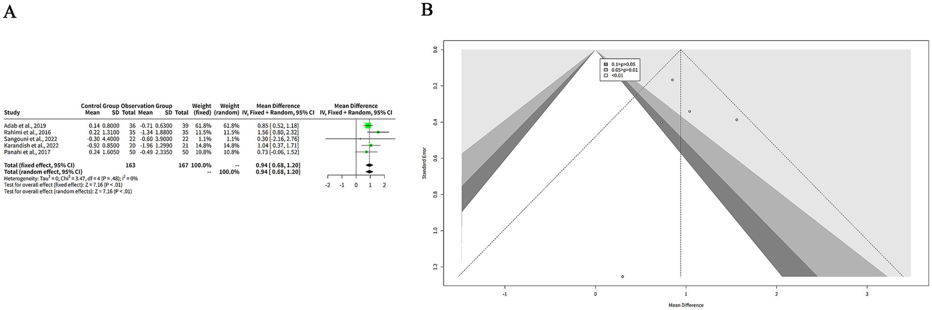 The funnel plot in Figure 4B is relatively symmetrical, with most studies concentrated in the middle and lower part of the graph. This suggests that there is no significant publication bias or heterogeneity among the studies. However, one study by Sadeghzadeh et al. (8) is located at the bottom right corner of the plot, indicating a large and positive effect size with low precision. This study is an outlier and may have a different population or intervention than the other studies.