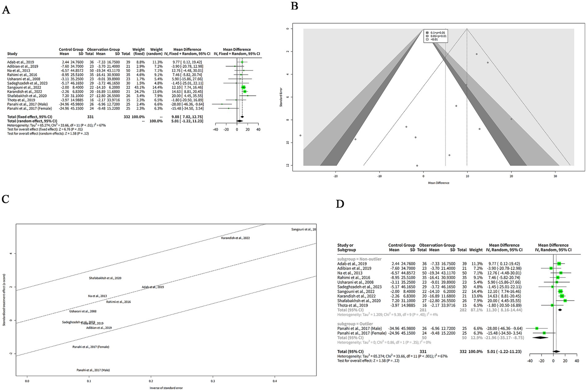 Figure 5. The effect of curcumin on HDL-C levels. (A) Forest plot of the effect of curcumin on HDL-C levels. (B) Funnel plot of the effect of curcumin on HDL-C levels. (C) Galbraith plot of the effect of curcumin on HDL-C levels. (D) Forest plot of the subgroup analysis of the effect of curcumin on HDL-C levels.