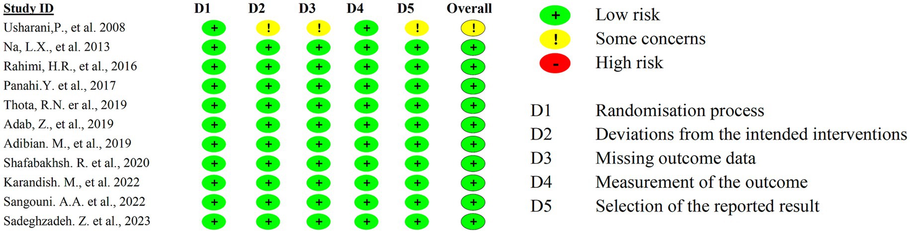 The studies were conducted in four countries: Iran (9–16), China (17), India (18), and Australia (19). The majority of the studies (9 out of 11) were from Iran, and they had a fair or good quality rating. The study by Na et al. (3) was from China, and it had a good quality rating (Table 1). The study by Usharani et al. (4) was from India, and it had a fair quality rating. The study by Thota et al. (5) was from Australia, and it had a fair quality rating. The studies varied in their study design, RCT ID, sample size, age, and gender. The details of each study are shown in the Table 2.