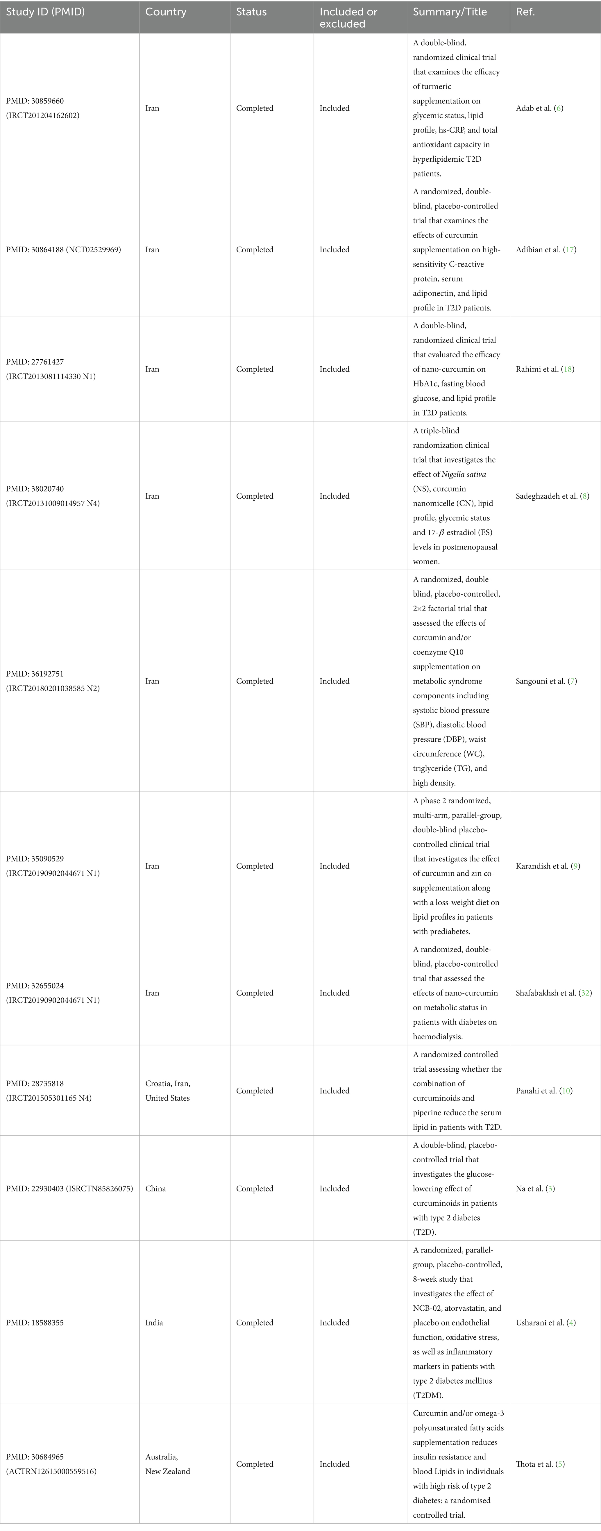 A deeper exploration of curcumin’s dosage and supplementation duration is warranted, as these factors may influence the heterogeneity observed. Studies with smaller sample sizes and shorter intervention durations, such as Adab et al. (6) and Sangouni et al. (7), highlighted the potential impact of these variables. For instance, Adab et al. (6) concentrated on a highly selective population (patients with type 2 diabetes and hyperlipidemia), whereas Sangouni et al. (7) included a broader group of patients with metabolic diseases, while had a brief intervention period. These differences underscore the need for subgroup analyses to elucidate the influence of study characteristics on curcumin’s effects.