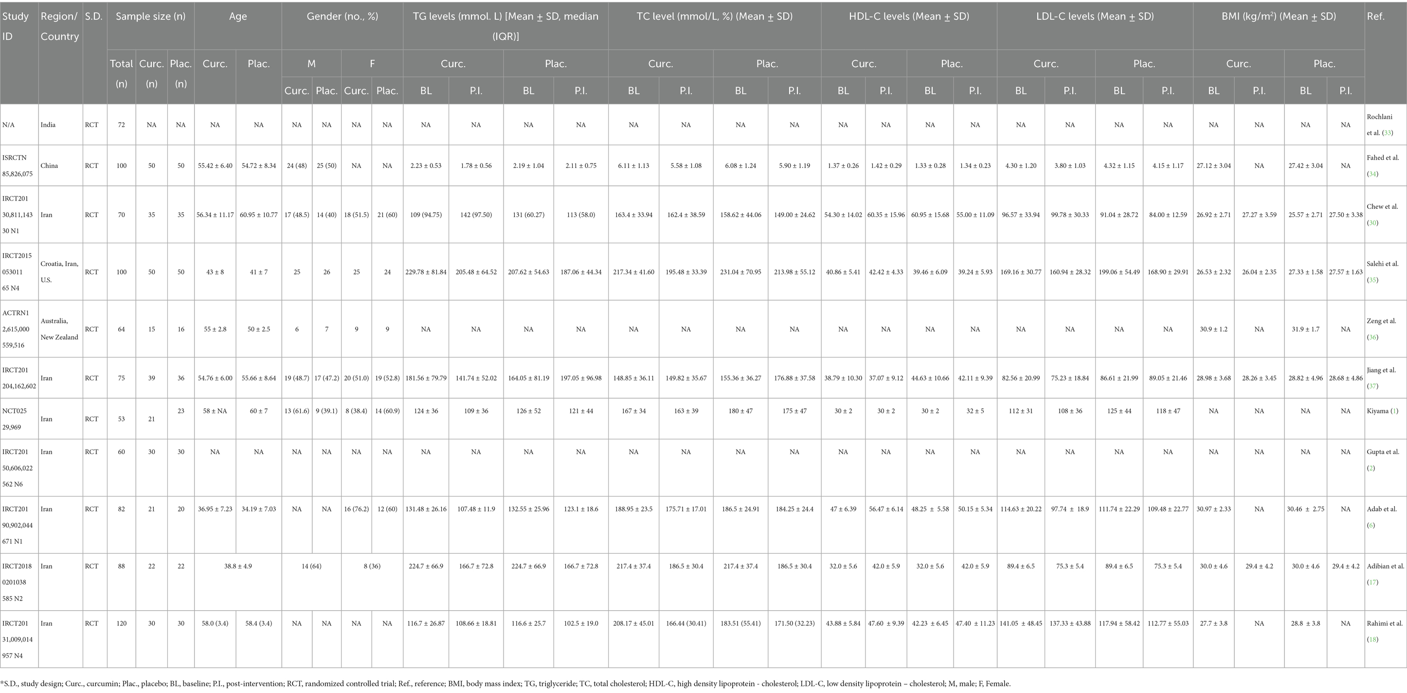 Curcumin, a bioactive compound derived from the spice turmeric, has garnered significant attention due to its wide-ranging therapeutic properties, including anti-inflammatory, antioxidant, and lipid-modifying effects (4–6). Beyond its traditional use in culinary and medicinal practices, curcumin has emerged as a promising candidate for managing metabolic parameters. Preclinical studies and randomized controlled trials (RCTs) have highlighted its potential in modulating blood lipid levels, body mass index (BMI), and other markers of metabolic health. For instance, Kiyama et al. (1) demonstrated curcumin’s capacity to regulate blood glucose and lipid levels in diabetic patients, while Gupta et al. (2) provided evidence of its efficacy in improving metabolic health outcomes.