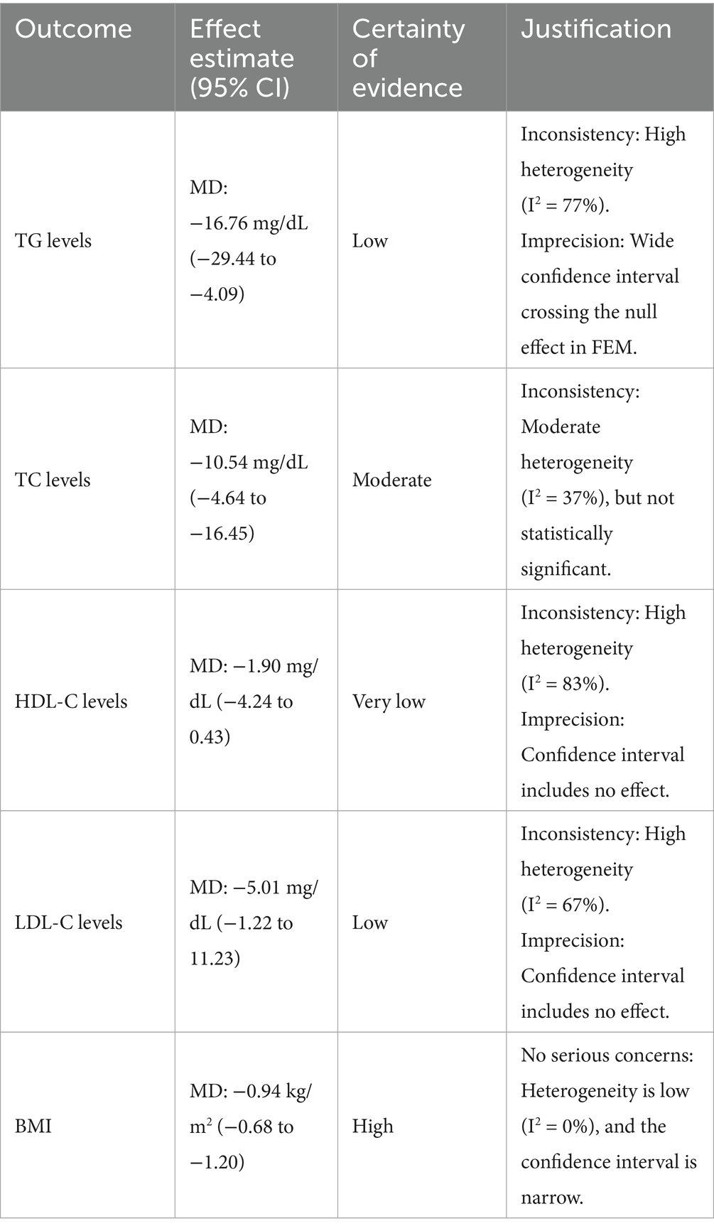 To formally assess the certainty of our findings, we applied the GRADE (Grading of Recommendations Assessment, Development and Evaluation) framework, and the results are presented in Table 3. Our analysis indicates a high certainty of evidence for the significant reduction in BMI, supported by a low heterogeneity (I2 = 0%) and a precise effect estimate. In contrast, the evidence for a significant effect on lipid profiles varies. We found moderate certainty of evidence for the reduction in TC levels due to moderate heterogeneity (I2 = 37%), while the evidence for TG and LDL-C reductions was graded as low certainty due to high inconsistency and imprecision, respectively. The certainty of evidence for the effect on HDL-C was categorized as very low, primarily because of high heterogeneity (I2 = 83%) and a wide confidence interval that included no effect. These findings highlight the variable confidence in the pooled results for each metabolic parameter and underscore the influence of heterogeneity on the overall evidence quality.
