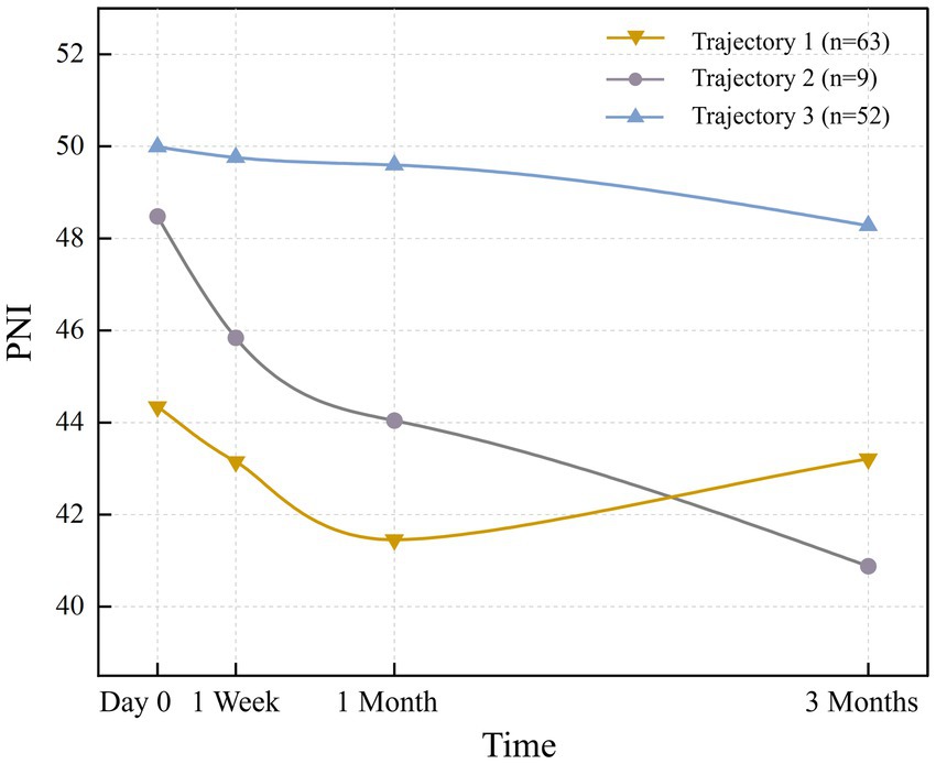 A deteriorated low PNI status indicates a poor prognosis for patients, which is consistent with the results of other studies (65–68). This study identified a high-risk population with significant clinical significance (Trajectory 2, p < 0.001), whose survival rate was lower (median survival time: 281 days < 1 year), which was consistent with the results of other studies (4), but more importantly, it identifies this high-risk population prospectively through its dynamic trajectory pattern. This finding suggests that clinical intervention should focus on this group of patients, improving their poor prognosis through enhanced nutritional support and close monitoring. It is worth noting that although the evolution processes of trajectories 1 and 3 are different, there is no difference in long-term survival rates (χ2 = 2.356, p = 0.125), suggesting that the adverse trends that emerged in the early stage are not irreversible. If timely intervention is carried out within the critical time window after surgery to reverse the downward trend, the prognosis of the patient can still reach a level comparable to that of the initially stable patient. Therefore, implementing precise intervention for high-risk groups can optimize the allocation of clinical resources and improve the overall survival outcomes of patients.