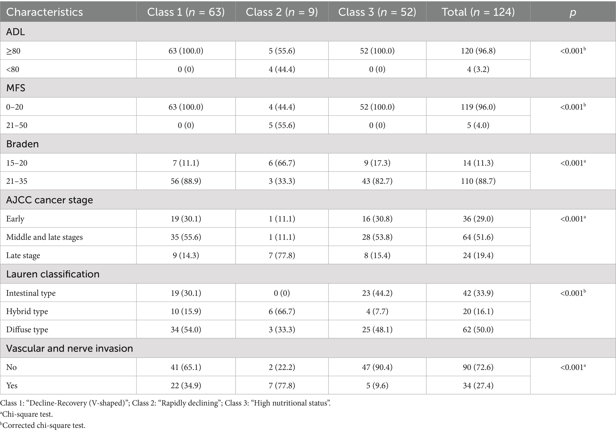 Multiple logistic regression was used to identify significant factors affecting nutritional status trajectories (Table 3). Detailed data can be found in Supplementary Table S4. The results showed that ADL, MFS, AJCC Cancer Stage and vascular and nerve invasion were influential factors in the postoperative nutritional status trajectory of GC patients.