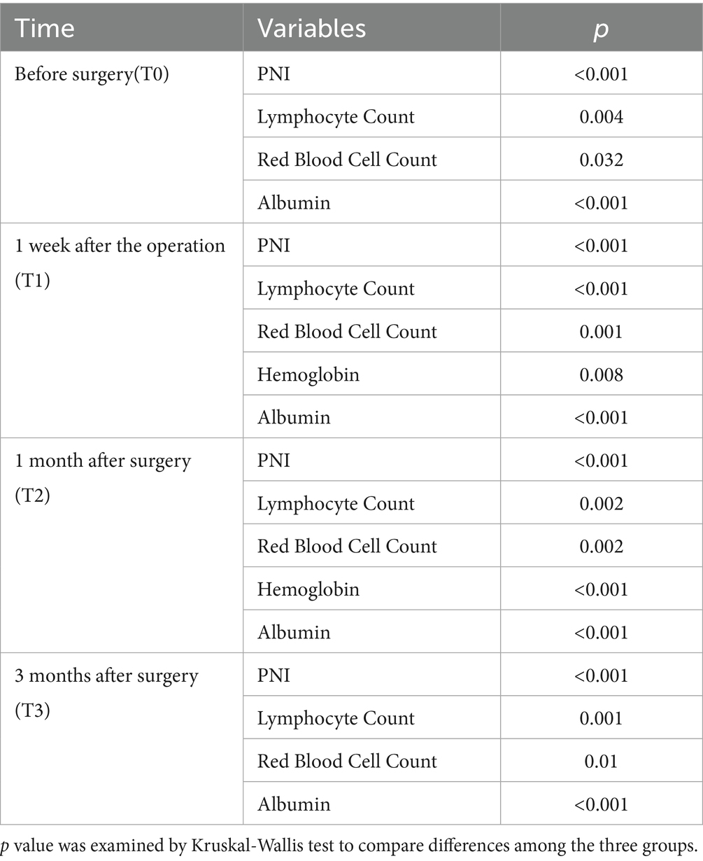These items include PNI (PNI = serum albumin (g/L) + 5 × total lymphocyte counts (109/L) (31, 32). This validated composite biomarker evaluates nutritional status, immunological competence, and surgical prognosis (33, 34)), BMI, hemoglobin (g/dL), serum albumin (g/L), leukocyte count (×109/L), lymphocyte count (×109/L), erythrocyte count (×1012/L), platelet count (×109/L). The primary outcomes were PNI; secondary outcomes were BMI, serum albumin, hemoglobin, leukocyte, lymphocyte, erythrocyte, and platelet concentrations. Nutritional parameters were assessed at three time points: preoperative baseline (≤48 h pre-surgery), postoperative 7 days (±2 days), postoperative month 1 (±3 days), and postoperative month 3 (±7 days).