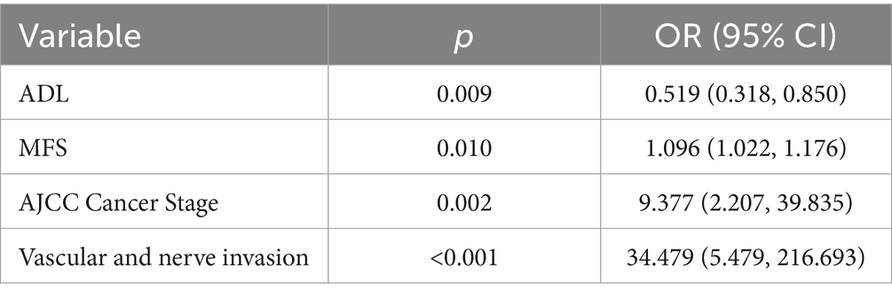 This study employed multiple logistic regression analysis to identify key determinants of nutritional trajectories. AJCC Cancer Stage and vascular and nerve invasion types significantly affect the development trajectory (p < 0.01), which is consistent with the conclusions of previous studies (17, 57, 58). However, the critical implication of our findings lies not merely in identifying this high-risk population, but in interrogating what modifiable factors might mitigate their risk or, conversely, what reversible deficits propel them toward the worst outcomes. Our analysis reveals that beyond fixed tumor characteristics, functional and physiological markers—specifically, low ADL scores and high MFS—are powerfully associated with poor nutritional trajectories. This is a pivotal finding because unlike tumor stage, functional capacity and frailty are dynamic and potentially improvable through targeted prehabilitation and rehabilitation programs.