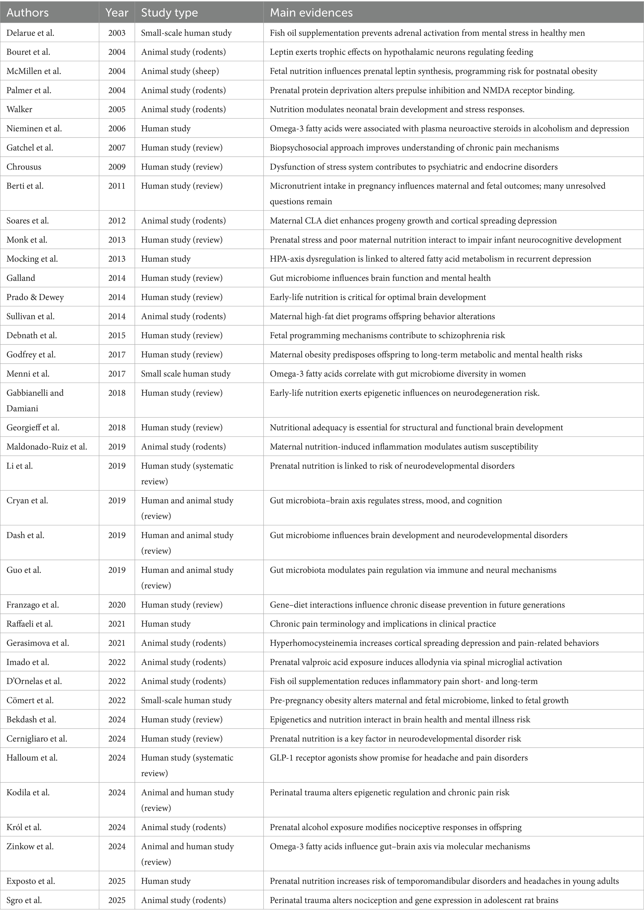 We searched keywords such as “prenatal nutrition and pain modulation,” “prenatal factors and pain,” and “early nutrition and stress response” on PubMed and Google Scholar, selecting the main reviews from 2000 to 2025, excluding individual cases, so we identified 39 studies (Table 1).