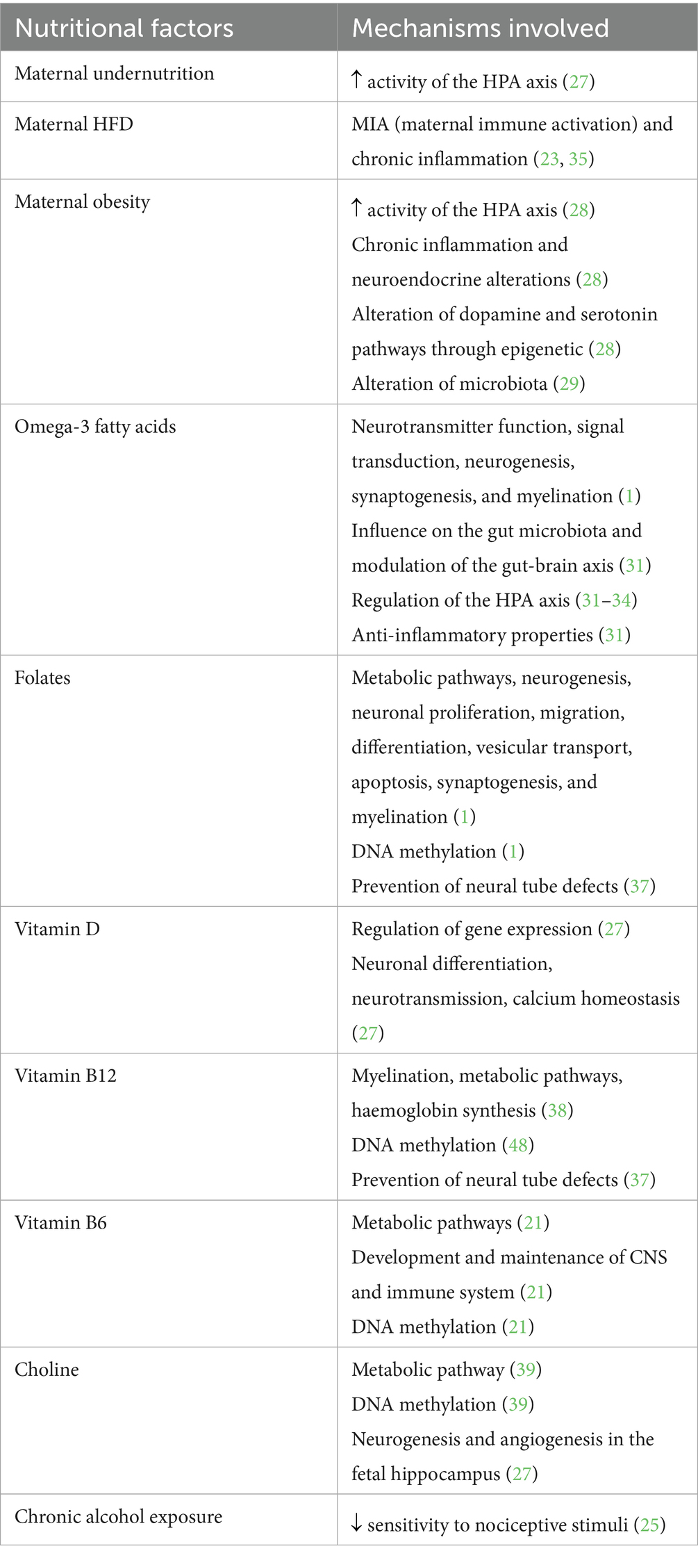 Li et al. (36) produced a systematic review showing the association between prenatal nutrition and neurodevelopmental disorders. Especially, they highlighted that a decreased folate intake provokes incorrect DNA methylation, leading to an alteration of brain development. Limitations are related to heterogeneity of included studies; moreover, some data is based on self-reported dietary intake.