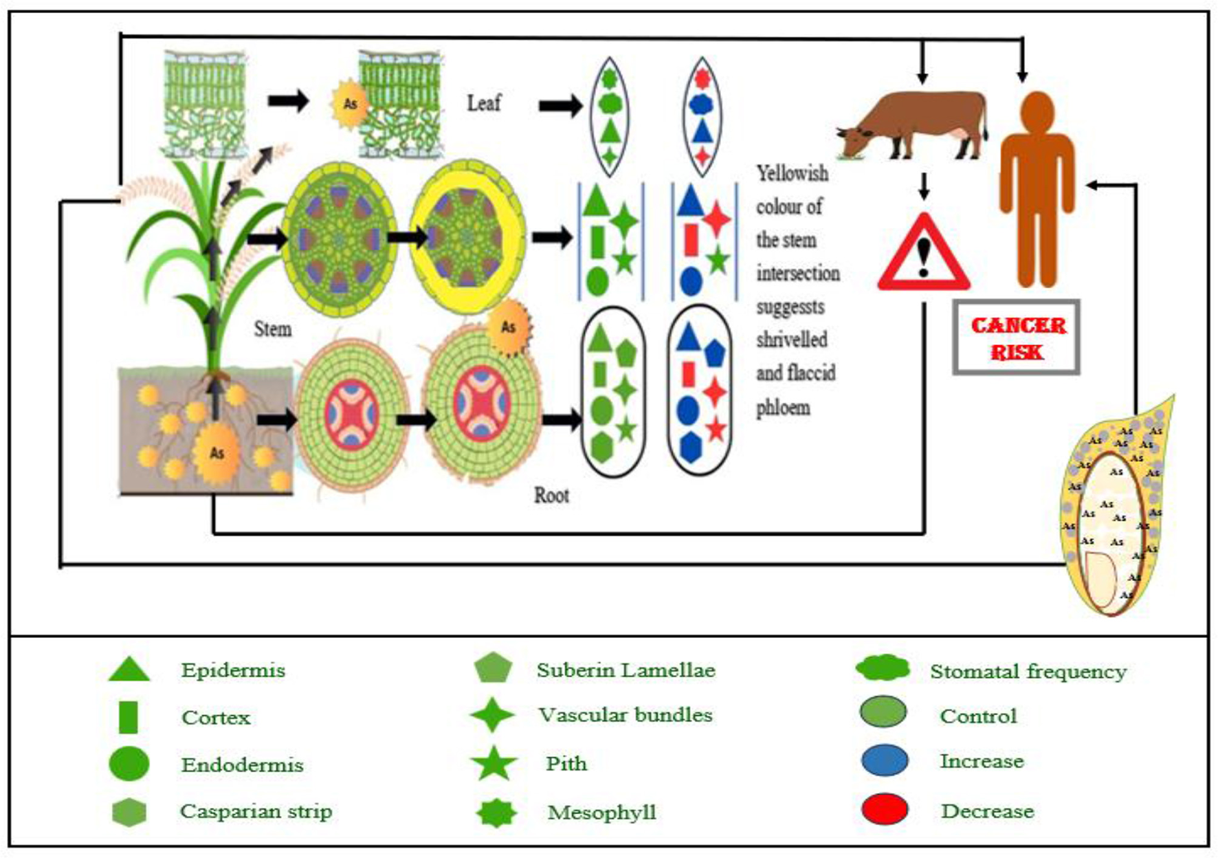 Arsenic contamination impacts food security and increases cancer risk for humans and animals by altering nutrient mobilization from soil to plants and affecting the structural organization of various plant parts. Abbreviation: As, Arsenic.