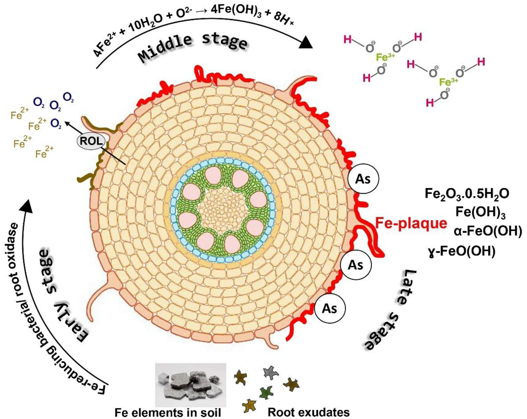 The interaction between Si, iron (Fe) plaques, and As at the root–soil interface is a critical process influencing As uptake and toxicity in wetland crops, especially rice (Figure 3). Rice cultivated in inundated soil conditions, along with other aquatic flora, develops a Fe plaque on the root surfaces as a result of pronounced redox gradients from the roots to the reduced bulk soil. The diminished bulk soil is defined by the reductive dissolution of iron oxide minerals, leading to elevated Fe(II) concentrations in the soil solution (25, 72). Oxygen escaping from the expanded gas cavities of aerenchyma tissue into the rhizosphere, known as radial oxygen loss, significantly influences the redox chemistry in close proximity to the root (73, 74). The oxic rhizosphere facilitates the fast oxidation of porewater Fe(II) to insoluble Fe(III) precipitates on the exterior of roots, predominantly at root tips and lateral root junctions (75, 76). Figure 4 depicts the sequential formation of Fe plaque in distinct stages. This Fe plaque is predominantly made up of the Fe oxyhydroxides ferrihydrite [Fe(OH)3·nH2O], lepidocrocite (γ-FeOOH), and goethite (α-FeOOH) (77, 78). The elevated zero charge potential of FeOx (>7) facilitates the formation of robust inner-sphere adsorption complexes with various anions and promotes adsorption at edge and corner sites (79). Porewater containing arsenate [As(V), H3AsO4] and arsenite [As(III), H3AsO3] exhibits significant monodentate or bidentate complexation with iron plaque (80). Ferrihydrite is a highly reactive mineral that initially predominates in the rhizosphere but can subsequently convert into the more crystalline forms of lepidocrocite and goethite over time. Anions adhere to the edge and corner sites of FeOx, with ferrihydrite exhibiting a greater abundance of the more robust edge sites compared to the other two (81).