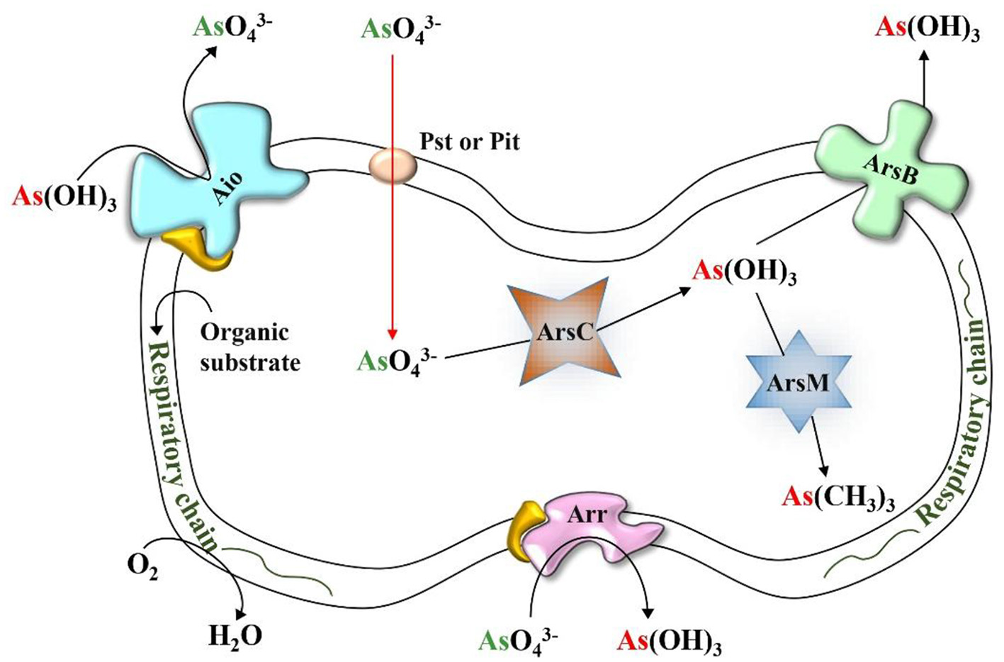 The archetypal aio system, the aioBA operon, was first identified and completely sequenced from the β-proteobacteria Herminiimonas arsenicoxydans. It encodes arsenite oxidase (Aio), comprising two subunits: AioA, the large molybdopterin-containing catalytic unit, and AioB, a small Rieske [2Fe-2S] cluster protein (94). Aio catalyzes the oxidation of As(III) to As(V) through four sequential electron transfer steps (95). Stopped-flow spectroscopy and isothermal titration calorimetry revealed that As(III) binds near a funnel-shaped cavity of AioA, where polar residues coordinate it via the molybdopterin cofactor. The bound As(III) donates electrons to the Mo(VI) center, reducing it to Mo(IV) while being oxidized to As(V) at rates exceeding 4,000 s−1. Electrons are then rapidly transferred from Mo to the Rieske centers. The final, rate-limiting step involves electron transfer from the AioB Rieske cluster to the terminal electron acceptor, cytochrome c, completing the catalytic cycle (96).