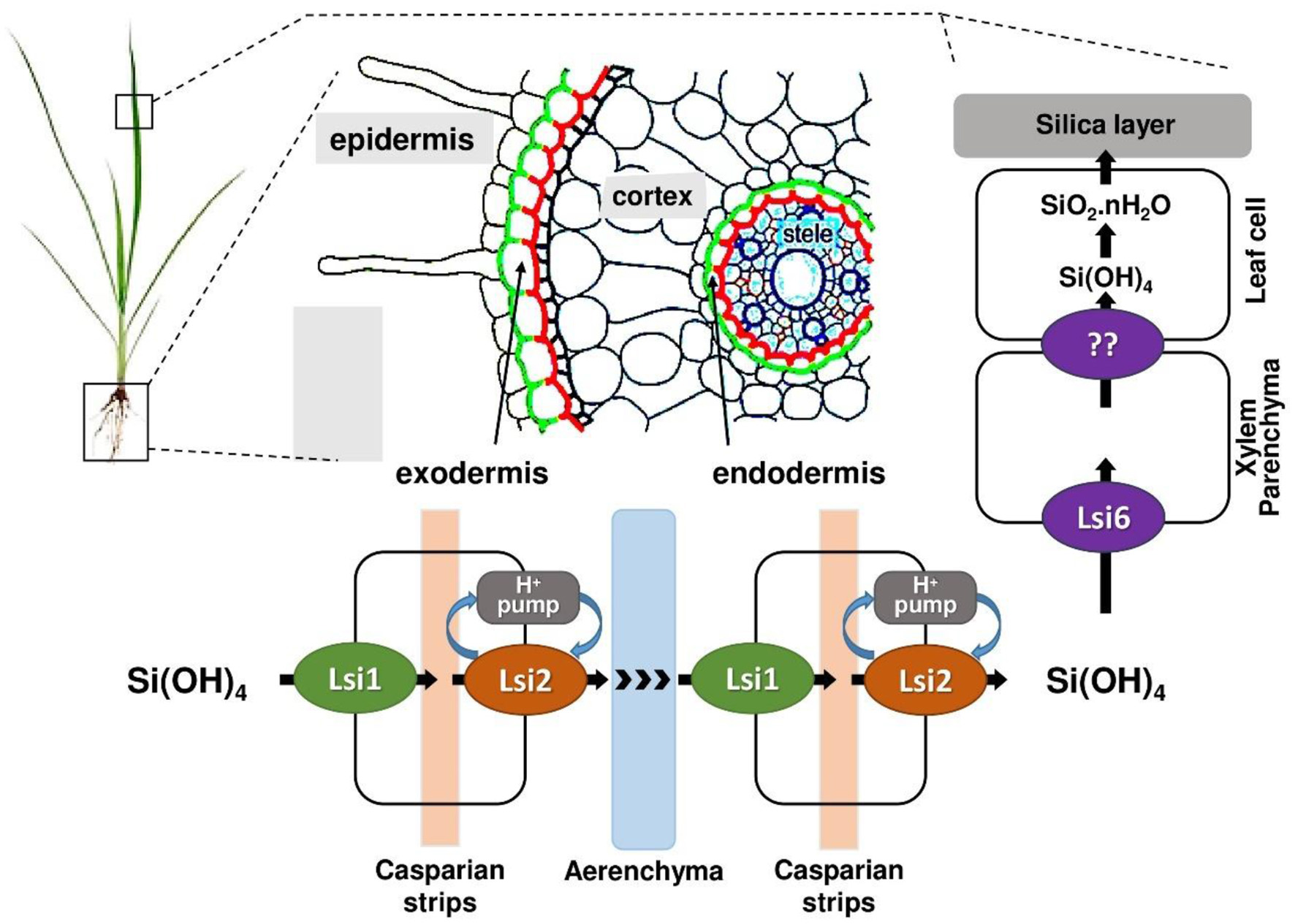 Both Lsi1 and Lsi2 are polarly localized in the plasma membranes of root cells but on opposite sides. Lsi1 is localized on the distal (outer) side of both exodermis and endodermis cells as shown in Figure 6, facilitating the influx of silicic acid from the soil into root cortical cells (113, 117). On the other hand, Lsi2 is localized on the proximal (inner) side of the same cells, promoting the efflux of silicic acid from the root cells into the stele (Figure 6), enabling xylem loading and translocation to the shoot (115). Lsi1 operates via passive transport, relying solely on the concentration gradient of silicic acid. It does not require energy input in the form of ATP or electrochemical gradients. This aligns with its role as a bidirectional channel that can facilitate both influx and efflux depending on substrate concentration (118). Whereas, Lsi2 functions via an active transport mechanism, coupling the efflux of silicic acid with the inward movement of protons. This energy-dependent process enables Lsi2 to transport silicic acid against its concentration gradient, a necessary step to move Si from root cortical cells into the xylem (115).