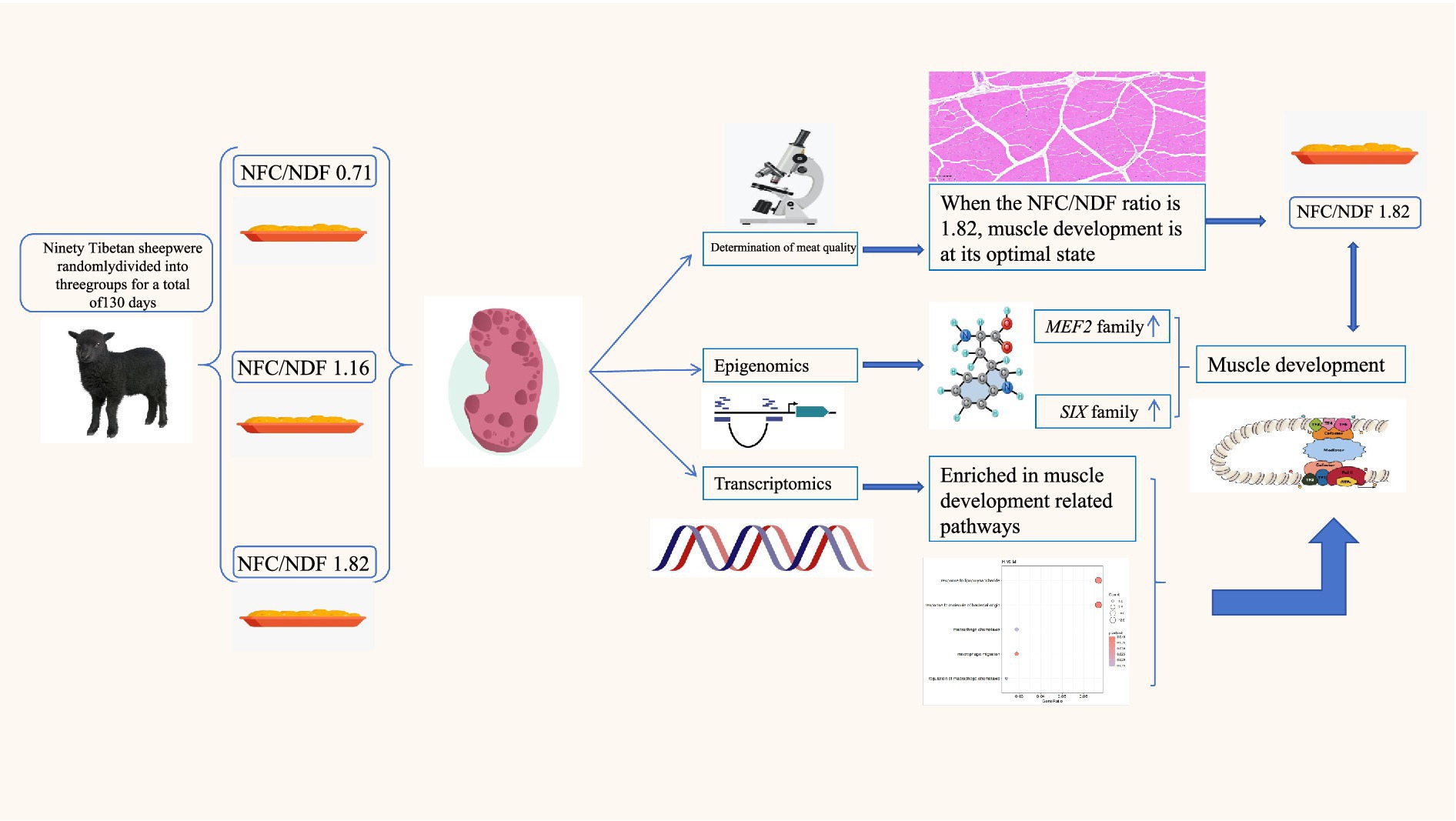 This investigation aims to elucidate the epigenomic heterogeneity in Tibetan sheep subjected to varying dietary ratios of non-fibrous carbohydrates (NFC) and neutral detergent fiber (NDF) through the integration of multi-dimensional data, encompassing phenotypic parameters (growth performance, meat physicochemical characteristics, and muscle histomorphology) and high-throughput molecular characterization techniques (RNA-seq, ATAC-seq, and CUT&Tag). Particular emphasis is placed on elucidating the functional role of epigenetic markers, notably H3K27ac, in the regulation of myogenesis and metabolic processes. Through the comprehensive application of multi-omics approaches, this research endeavors to delineate the regulatory mechanisms by which differing NFC: NDF dietary ratios modulate muscle quality in Tibetan sheep, thereby establishing a theoretical foundation for enhancing feeding efficiency and meat quality, ultimately contributing to the advancement of precision livestock production.