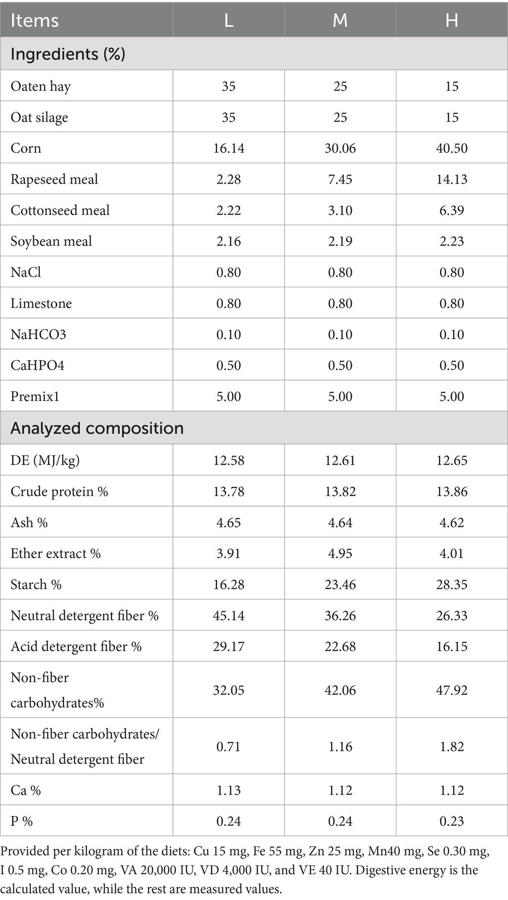 Methods: The subjects were 2-month-old weaned male Tibetan sheep with an initial body weight of 10.45 ± 0.96 kg. Using a completely randomized study design, 90 sheep were randomly assigned to three treatment groups with 30 sheep per group. Each treatment group consisted of 5 pens with 6 sheep per pen. The dietary NFC/NDF ratios of these three treatment groups were 0.71 (Group L), 1.16 (Group M) and 1.82 (Group H).