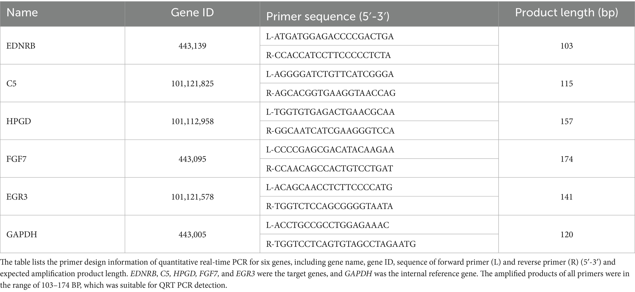 The cDNA library was prepared using the NEB#7530 kit (New England Biolabs, CA, USA), quality-checked, and sequenced on the Illumina HiSeq 2,500 platform at Gene Denovo Biotechnology Co., Ltd. (Guangzhou, China). Sequencing data quality was assessed using fastp (v0.18.0), with low-quality bases and adaptors trimmed using the FASTX toolkit. High-quality sequences were mapped to the Ovis aries (Tibetan sheep) reference genome (ASM1117029v1) using TopHat2 (v2.1.1). Differential gene expression was identified in terms of FPKM, and a comparative analysis across three groups was conducted using Cuffdiff. The functional annotation of differentially expressed genes (DEGs) was performed using the Gene Ontology (GO) database. Enrichment analysis was conducted using the GOseq R package and KOBAS software by applying a significance threshold of FDR ≤ 0.05. To validate the reliability of the RNA-Seq data, five genes were selected for quantitative real-time PCR (qRT-PCR) analysis, with glyceraldehyde-3-phosphate dehydrogenase (GAPDH) serving as the internal reference gene. All primer sequences utilized in this study are presented in Table 2.