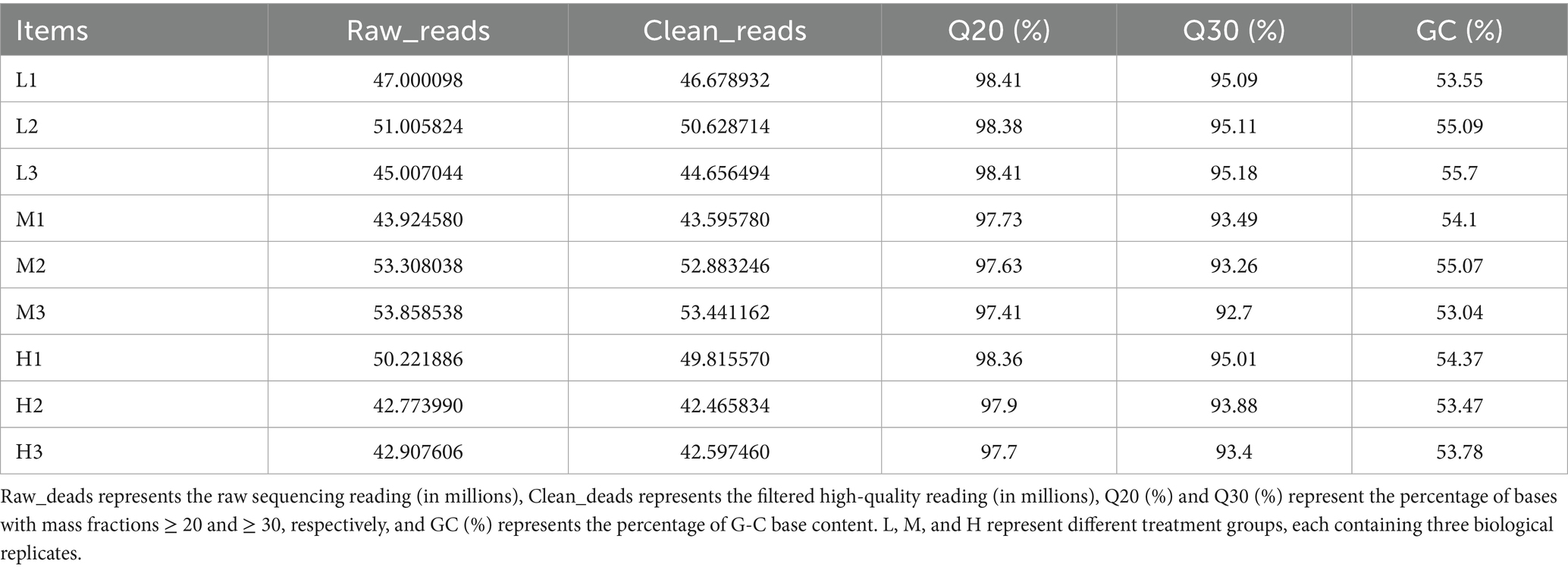 Total RNA was extracted from the Longissimus lumborum muscle of Tibetan sheep (n = 3) using TRIzol reagent (Thermo Scientific, MA, USA). The concentration and quality of RNA were evaluated using the Agilent 2,100 (Agilent, CA, USA) and NanoDrop 2000 (Thermo Scientific, MA, USA) systems to confirm the suitability of RNA samples for downstream library construction. Ribosomal RNA (rRNA) was selectively removed to retain all coding and non-coding RNAs, as recommended by prior RNA-seq workflows [(e.g., 14)]. The remaining RNA was randomly fragmented and used as a template to synthesize first-strand cDNA with random hexamer primers. Buffer, dNTPs, RNase H, and DNA Polymerase I were subsequently introduced to facilitate the synthesis of the second cDNA strand. Enzymatic treatment with UNG (Uracil-N-Glycosylase) was performed, followed by end repair, A-tailing, and sequencing adaptor ligation. The resulting 200-bp fragments were isolated through agarose gel electrophoresis and amplified via PCR to construct the sequencing library.