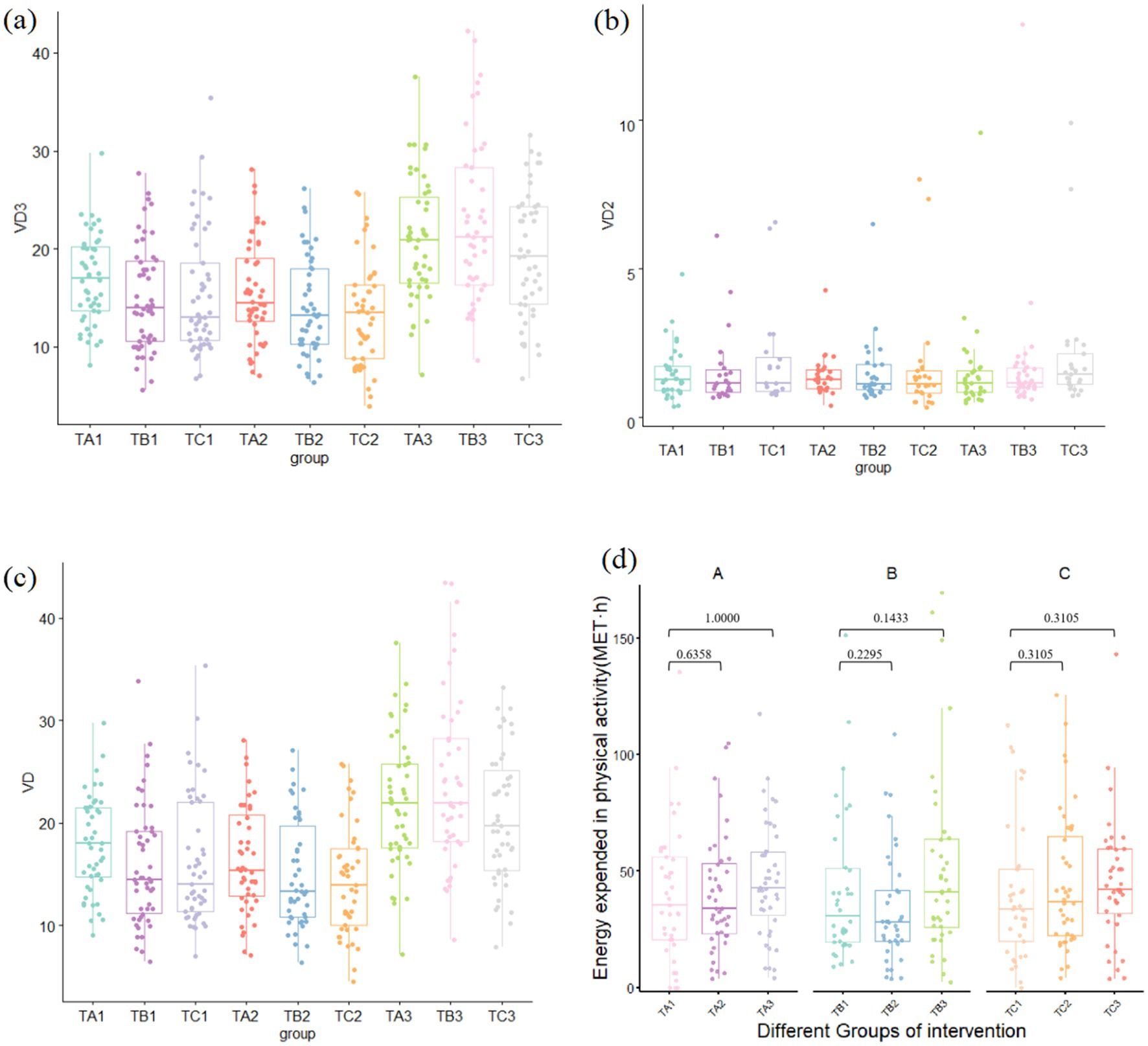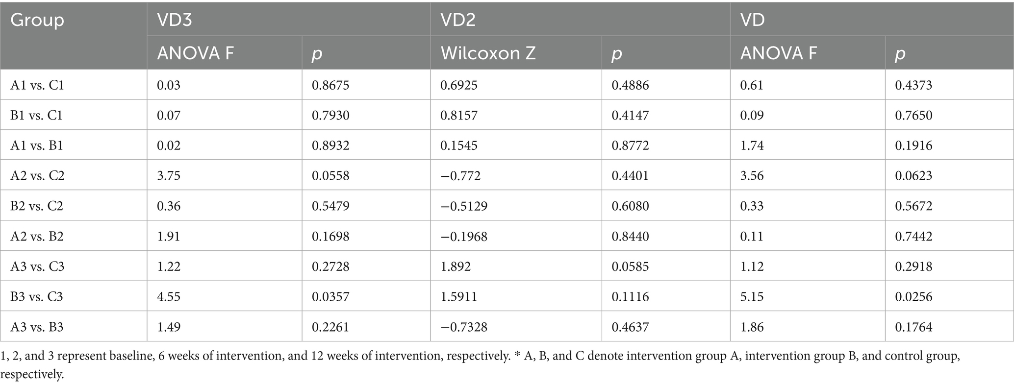 Serum 25-OH VD3, 25-OH VD2, and 25-OH VD levels were compared across groups at each intervention period, with no significant between-group differences in 25-OH VD2 levels observed at any time point. Based on the baseline and interim data, the results of the two-by-two comparisons between different groups of the three vitamin D indicators showed no statistically significant differences amongst the groups (p > 0.05). However, in the final data, serum 25-OH VD3 levels in the intervention group B were significantly higher than those in the control group C, as were the results of the between-group comparisons of 25-OH VD (25-OH VD3, p = 0.0357, 25-OH VD, p = 0.0256). No significant differences were noted between intervention groups A and B and between intervention group A and control group C (Table 6).