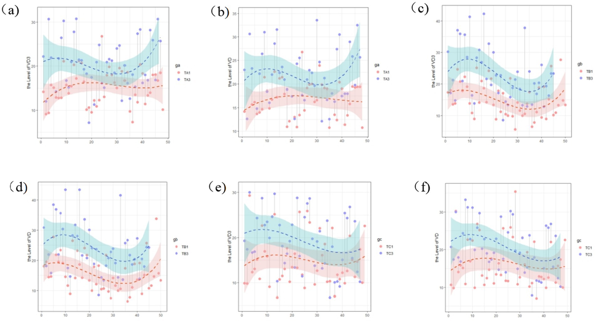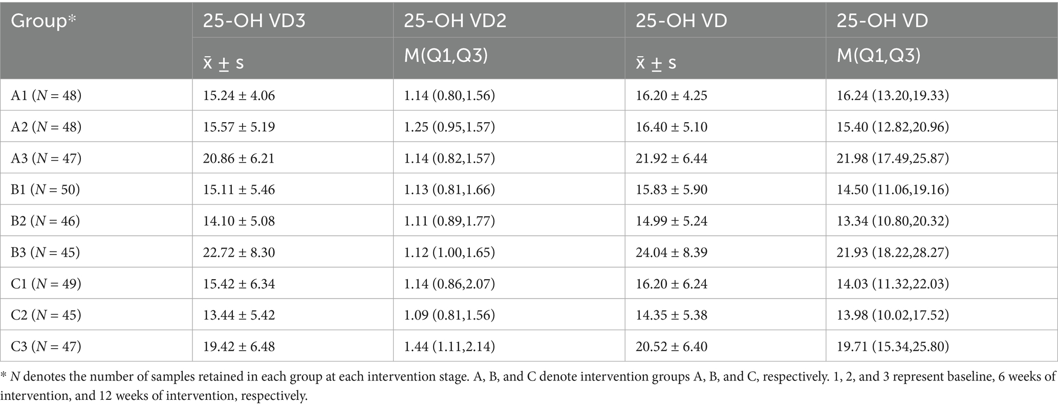The Kolmogorov–Smirnov normality test indicated that 25-OH VD3 and 25-OH VD concentrations in each study group conformed to a normal distribution (p > 0.05), and the normality of 25-OH VD2 in serum was a p-value of < 0.05; therefore, mean ± standard deviation (x̄ ± s) and quartiles were used to express them, respectively. 25-OH VD2 levels remained stable and low across all groups. Given that 25-OH VD3 constitutes the majority of circulating vitamin D, total 25-OH VD trends closely mirrored those of 25-OH VD3 (Table 3).