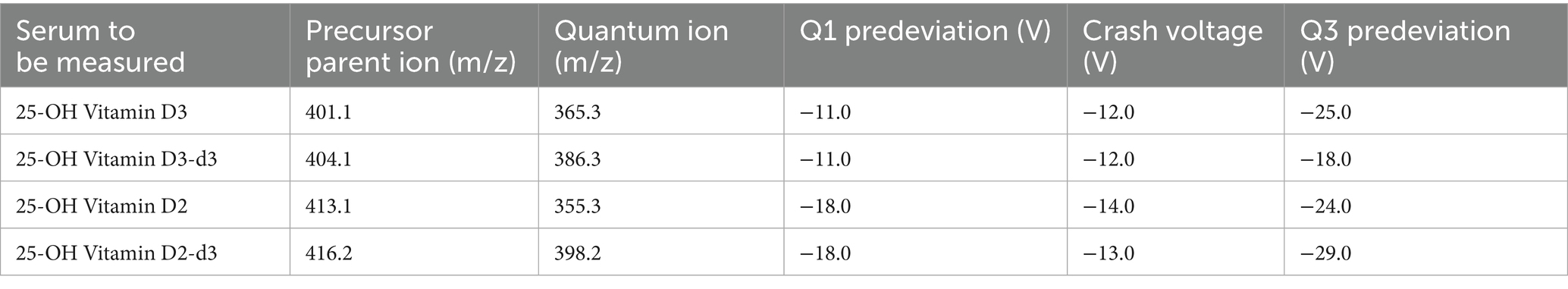Based on the above discussion, this study conducted a whole-grain intervention programme to evaluate changes in serum vitamin D levels amongst pre-diabetic adults in China. Serum 25-OH VD concentrations were determined via this protocol: samples were purified and concentrated after pretreatment, separated by liquid chromatography, detected by tandem MS in multiple reaction monitoring mode, and quantified using the isotope internal standard method. One quality control product was added to every 20 samples during the detection process to ensure the quality of the entire batch. This method can accurately determine the concentrations of 25-OH VD3 and 25-OH VD2 in the samples.