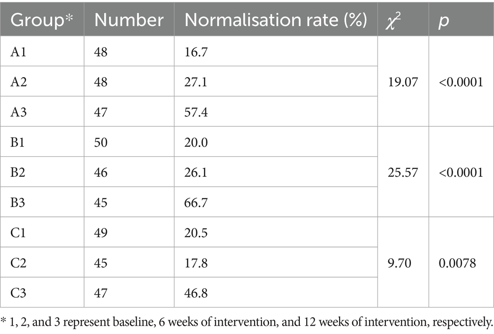 The distribution of participants with normal serum 25-OH VD levels in the intervention and control groups at different time points is shown in Table 4. In both intervention groups (A and B), the number of participants with normal 25-OH VD levels increased progressively from baseline to the interim assessment and further to the final assessment. These increases were statistically significant (p < 0.0001). In control group C, the number of participants with normal levels of 25-OH VD in the final assessment was significantly higher than that in the interim and baseline assessments (p < 0.0078). At baseline, the normalisation rate in the control group did not differ from that in the two intervention groups. However, after 12 weeks of whole-grain dietary intervention, the normalisation rates in both intervention groups were higher than those in the control group.