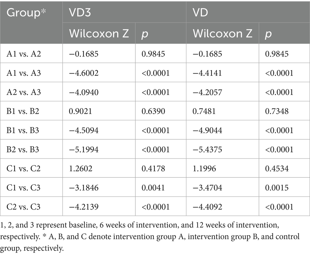 Within-group comparisons of serum 25-OH VD3 and 25-OH VD levels showed broadly consistent trends across the intervention and control groups, with vitamin D levels being significantly higher than those in the baseline data (Figure 2). There were no significant differences between the baseline and interim assay results for each group (p > 0.05). The 25-OH VD3 and 25-OH VD levels were significantly higher in all groups in the final assay, and the differences between the baseline and interim data were statistically significant (p < 0.05) (Table 5).