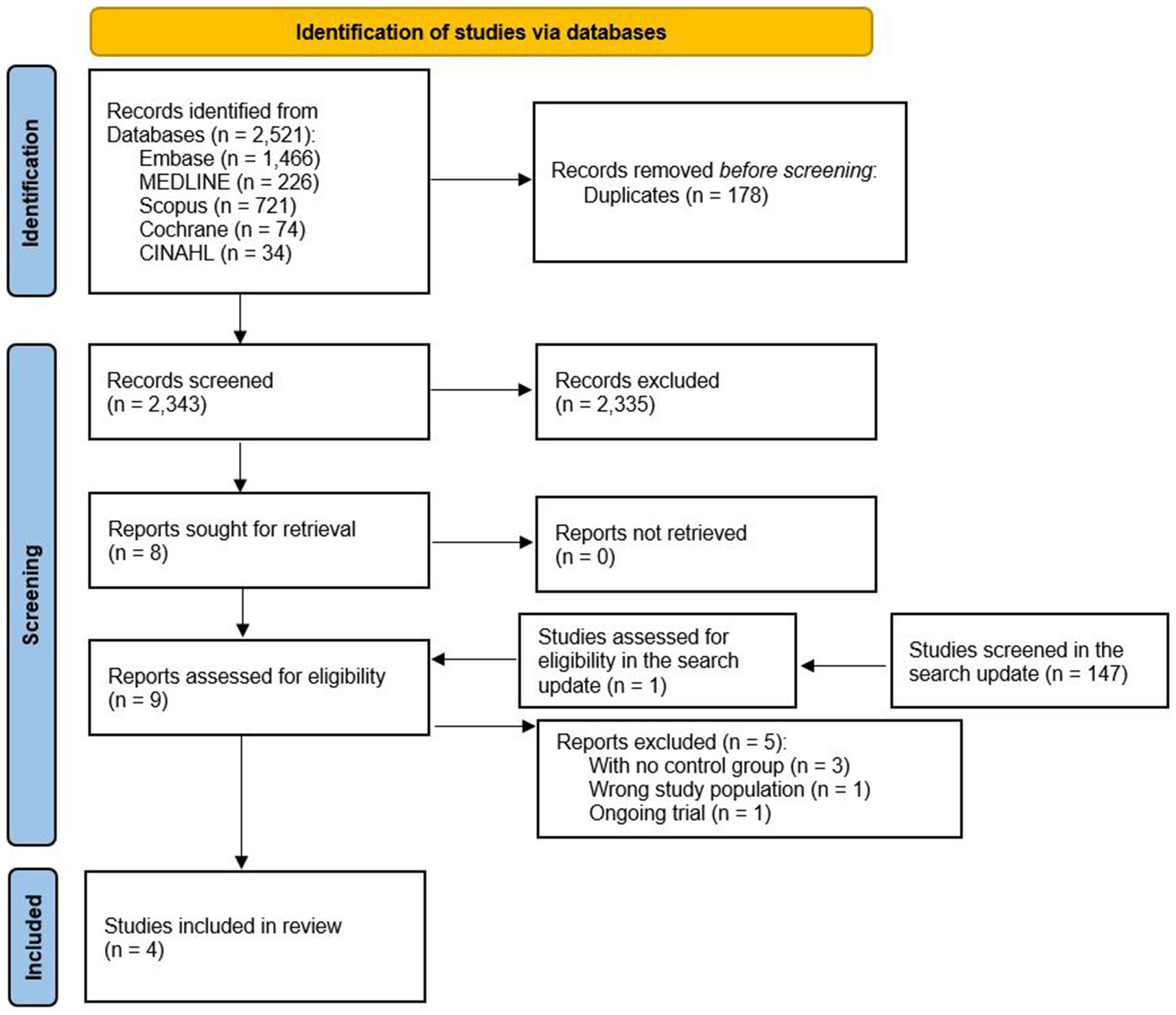 The initial search identified 2,521 records, and after the exclusion of duplicates (n = 178), a total 2,343 articles were assessed for eligibility. In the first screening step, where abstracts and titles were screened, 2,335 records were excluded, and 8 full texts were comprehensively screened for eligibility. Additionally, one full-text article identified in the search update was also assessed for eligibility. Of these, five trials were excluded because of the absence of a control group (n = 1) wrong study population (n = 1), and unfinished study (n = 1). Thus, this systematic review included a total of four articles involving 1,270 participants (one cohort study (21) and three trials (22–24)) (Figure 1).