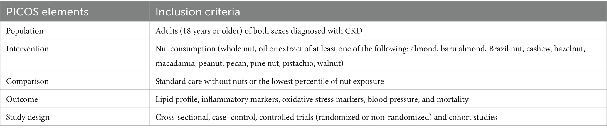 Inclusion and exclusion criteria were formed based on the PICOS (population, intervention, comparison, outcome, and study design) format, described in Table 1. We included articles that assessed nut intake in adults with CKD and were published in any language. Additionally, we evaluated changes in phosphorus and potassium levels as adverse effects of nut consumption in CKD. Excluded articles referred to studies that assessed individuals without CKD, did not have a comparative group, did not quantify dietary nut intake or combined nuts with other foods (e.g., seeds), or did not report on CKD-related outcomes. To complement the electronic search, reference lists from selected studies and reviews were manually examined.