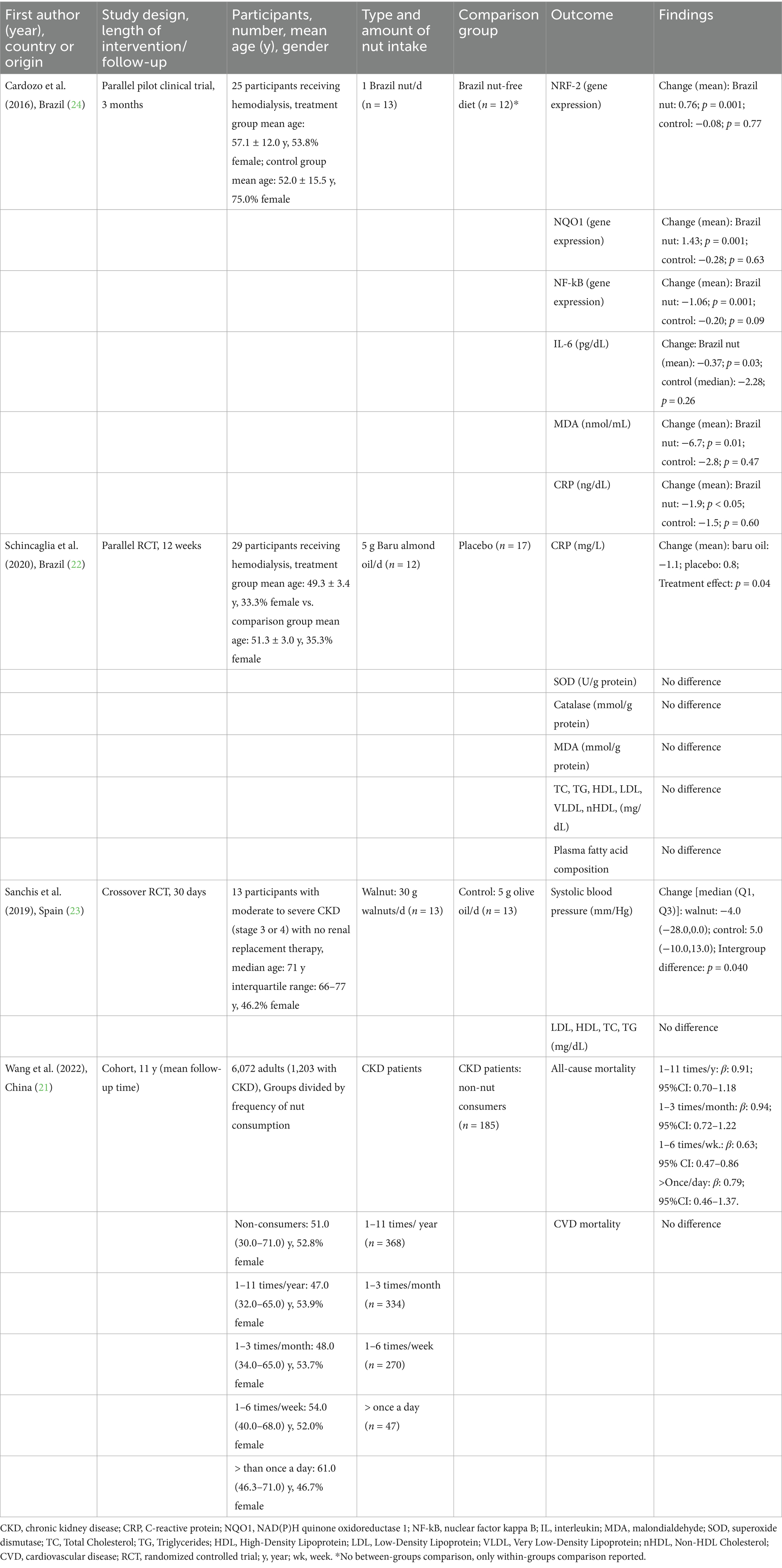 This review included two RCTs (one had a parallel arm (22), and one had a crossover design (23)), one pilot trial (24), and one cohort study (21). Out of the 1,270 participants included in the studies reviewed, 1,203 were part of the cohort study. Two trials were conducted with patients receiving hemodialysis treatment (22, 24), and Sanchis et al. (23) focused on patients receiving conservative management (without dialysis), while Wang et al. (21) did not report whether participants were receiving dialysis. While the observational study reported exposure to different nut types without specifying them (21), the trials supplemented baru almond oil (22), walnuts (23), or Brazil nuts (24). The duration of intervention in the trials ranged from 30 days (walnut study) (23) to 3 months (Brazil nut study; baru almond oil: 12 weeks) (24). Two studies assessed oxidative stress and inflammatory markers (22, 24), and lipid profile (22, 23), while arterial pressure (23), and mortality (21) were assessed. Given the heterogeneity of study designs, types of nuts consumed, and outcome measures reported in the studies included in this review, a meta-analysis of study results was not feasible; therefore, this review focuses on a narrative synthesis of study outcomes. The number of participants in each study, the interventions/exposures, and the outcomes are shown in Table 2 (21–24).