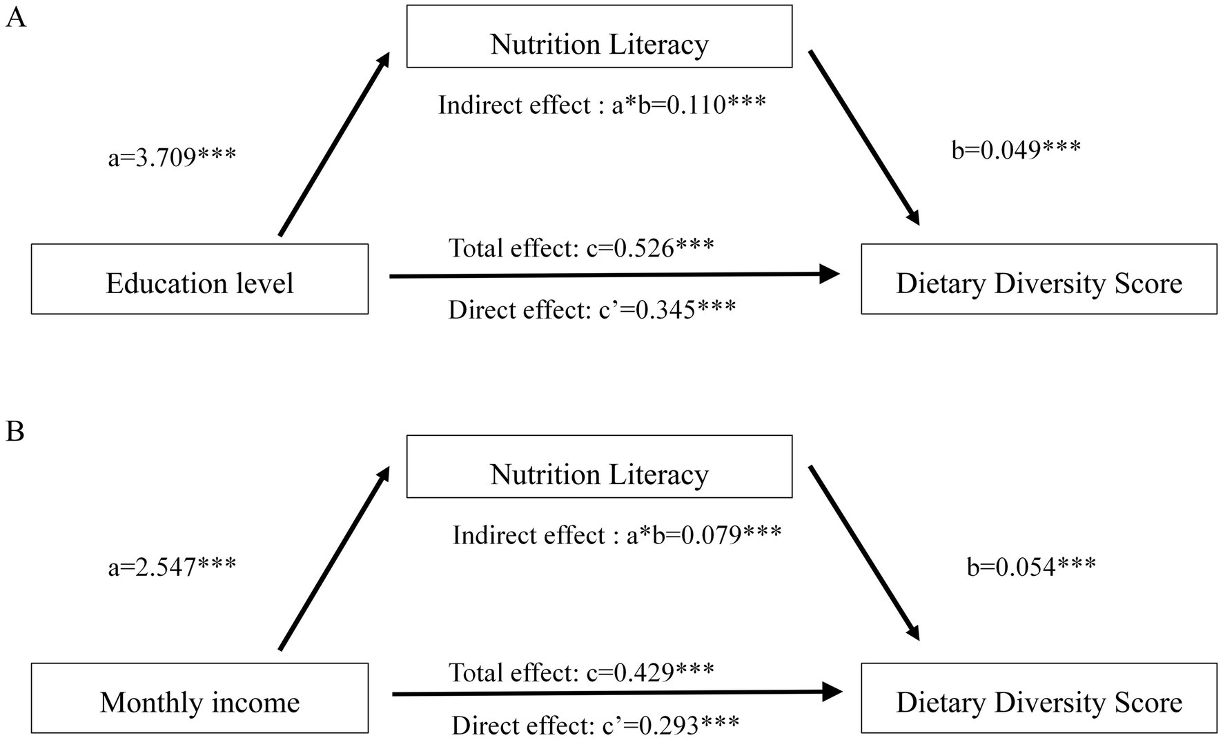Figure 1. The mediation model between socioeconomic status, nutrition literacy, and dietary diversity score after adjusting confounders. (A) Mediating effect of nutrition literacy on the association between education and dietary diversity. (B) Mediating effect of nutrition literacy on the association between monthly income and dietary diversity. c: the total effect of independent variable X on dependent variable Y. a: the effect of independent variable X on mediator M. b: the effect of mediator M on dependent variable Y after controlling for independent variable X. c’: the direct effect of independent variable X on dependent variable Y after controlling for mediator M. *p < 0.05; **p < 0.01; ***p < 0.01.