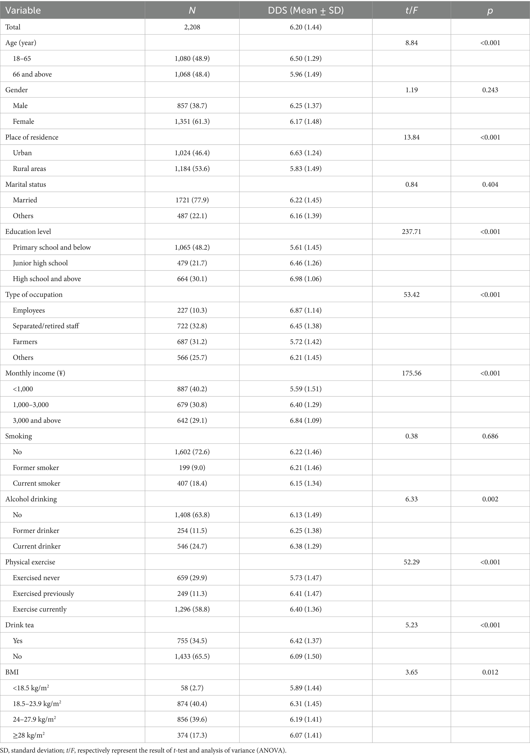 Table 1 presents the baseline characteristics of the study samples (n = 2,208). Among respondents, 48.9% were aged 18–65 years, 61.3% were female, 53.6% lived in rural areas, 77.9% were married, 48.2% had received a primary school or lower education, and 40.2% had a monthly income of less than 1,000 RMB. Participants who were younger, resided in urban areas, were employed, participated in exercise, and consumed tea exhibited relatively higher DDS.